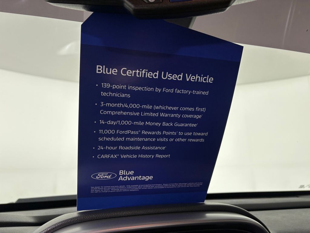 139 point vehicle inspection performed by an ASE Certified technician 3-month/4,000-mile Comprehensive Limited Warranty coverage that is fully competitive with other online retailers Blue Certification includes 11,000 FordPass Rewards Points For other manufacturers not listed above, Comprehensive Coverage is provided for 3 months or 4,000 miles, whichever comes first, from the signature date of the Ford Blue Advantage â" Blue Certified purchase. Comprehensive Limited Warranty covering 1,000+ components Travel expense reimbursement Rental car reimbursement SiriusXM 3 month tria. Recent Arrival!