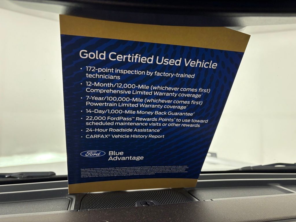 Ford Gold Certified includes:172 point vehicle inspection performed by a Ford Certified technician. 12-month/12,000-mile Comprehensive Limited Warranty coverage 7-year/100,000-mile Powertrain Limited Warranty coverage Gold Certification includes 22,000 FordPass Rewards Points Comprehensive Coverage: 12 months or 12,000 miles, whichever comes first, from the expiration of