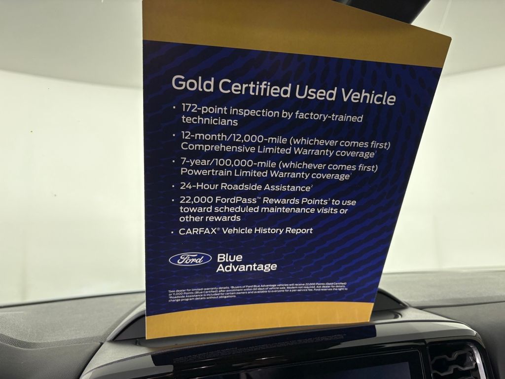 Ford Gold Certified includes:172 point vehicle inspection performed by a Ford Certified technician. 12-month/12,000-mile Comprehensive Limited Warranty coverage 7-year/100,000-mile Powertrain Limited Warranty coverage Gold Certification includes 22,000 FordPass Rewards Points Comprehensive Coverage: 12 months or 12,000 miles, whichever comes first, from the e
