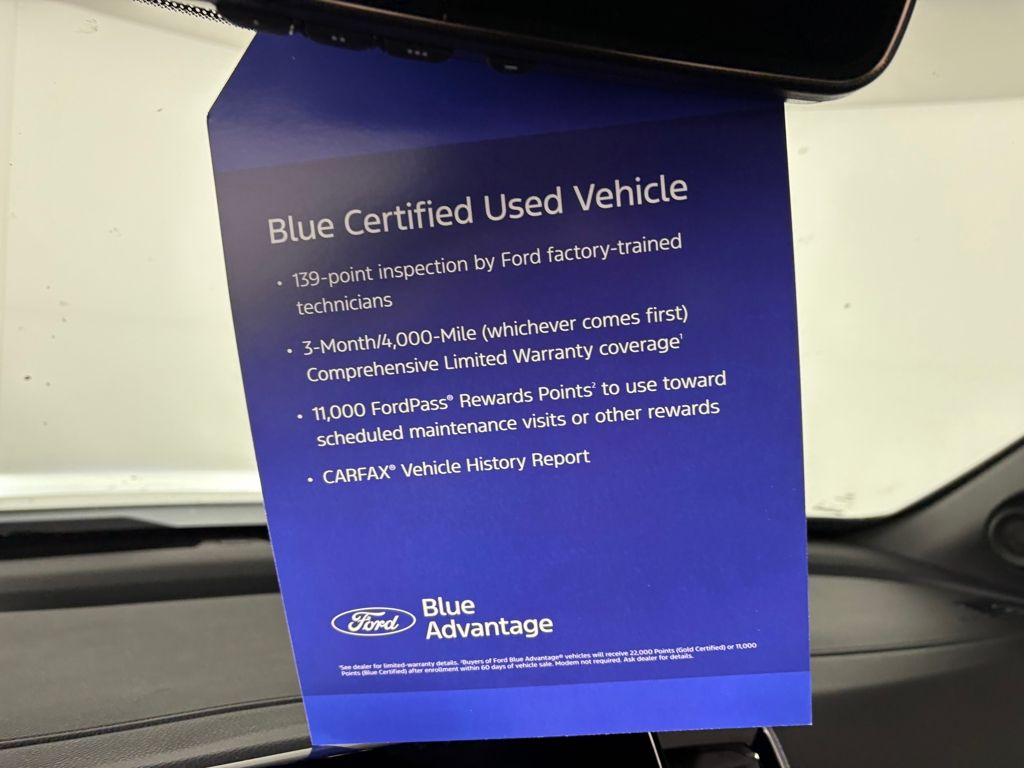 Ford Blue Certified includes:139 point vehicle inspection performed by an ASE Certified technician 3-month/4,000-mile Comprehensive Limited Warranty coverage that is fully competitive with other online retailers Blue Certification includes 11,000 FordPass Rewards Points For other manufacturers not listed above, Comprehensive Coverage is provided for 3 months or 4,000 miles, whichever comes first, from the signature date of the Ford Blue Advantage â" Blue Certified purchase. Comprehensive Limited Warranty covering 1,000+ components Travel expense reimbursement Ren