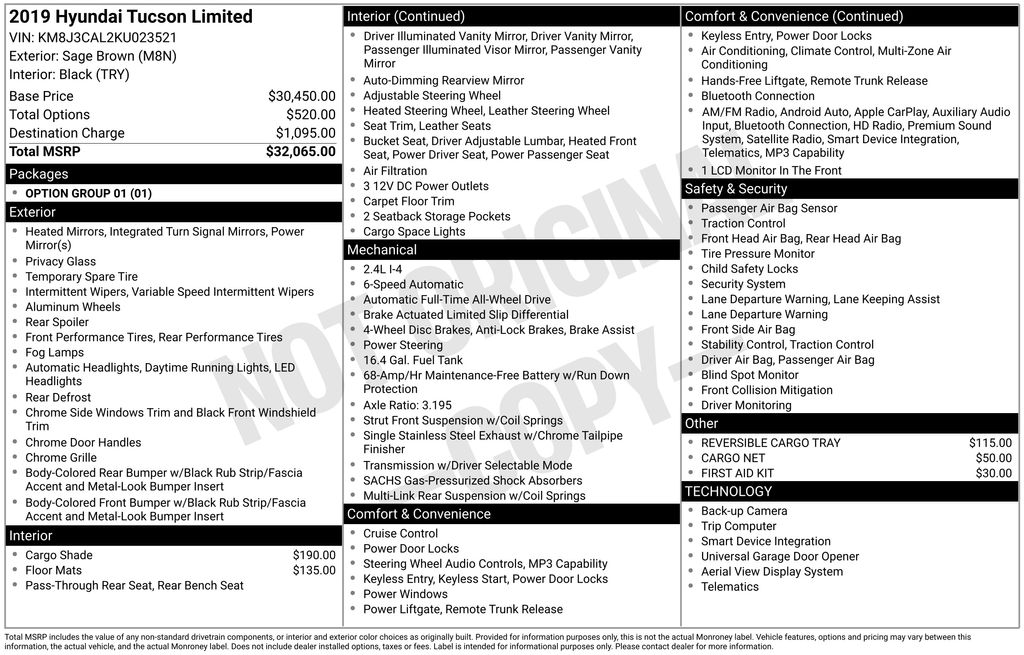 Option Group 01, AWD, 18" x 7.0J Alloy Wheels, 4-Wheel Disc Brakes, 8 Speakers, ABS brakes, Air Conditioning, Alloy wheels, AM/FM radio: SiriusXM, Apple CarPlay & Android Auto, Auto-dimming Rear-View mirror, Automatic temperature control, Axle Ratio: 3.195, Brake assist, Bumpers: body-color, Cargo Cover, Cargo Net, Carpeted Floor Mats, Delay-off headlights, Driver door bin, Driver vanity mirror, Dual front impact airbags, Dual front side impact airbags, Electronic Stability Control, Emergency communication system: Blue Link, Exterior Parking Camera Rear, First Aid Kit, Four wheel independent suspension, Front anti-roll bar, Front Bucket Seats, Front Center Armrest, Front dual zone A/C, Front fog lights, Front reading lights, Fully automatic headlights, Garage door transmitter: HomeLink, Heated door mirrors, Heated Front Bucket Seats, Heated front seats, Heated steering wheel, Illuminated entry, Leather Seat Trim, Leather Shift Knob, Low tire pressure warning, Occupant sensing airbag, Outside temperature display, Overhead airbag, Overhead console, Panic alarm, Passenger door bin, Passenger vanity mirror, Power door mirrors, Power driver seat, Power Liftgate, Power passenger seat, Power steering, Power windows, Radio: Infinity Audio System, Rear anti-roll bar, Rear seat center armrest, Rear window defroster, Rear window wiper, Remote keyless entry, Reversible Cargo Tray, Roof rack: rails only, Security system, Speed control, Speed-sensing steering, Split folding rear seat, Spoiler, Steering wheel mounted audio controls, Tachometer, Telescoping steering wheel, Tilt steering wheel, Traction control, Trip computer, Turn signal indicator mirrors, and Variably intermittent wipers.