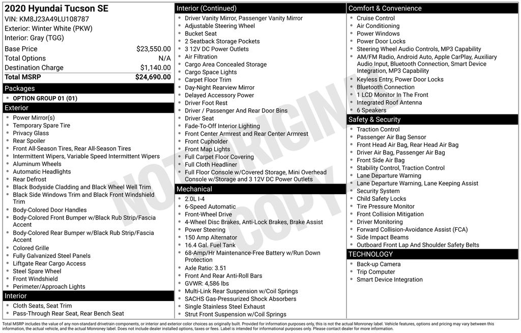 Winter White 2020 Hyundai Tucson SE FWD 6-Speed Automatic with Shiftronic I4 23/28 City/Highway MPG