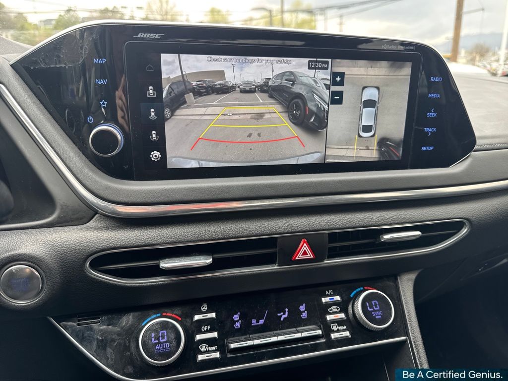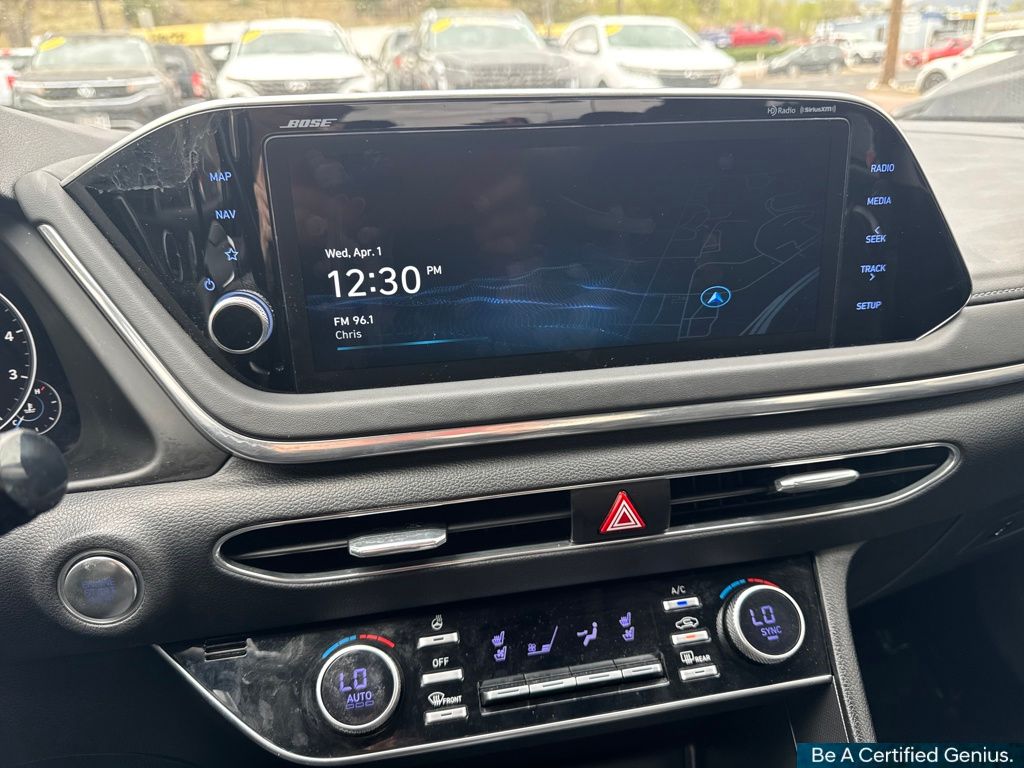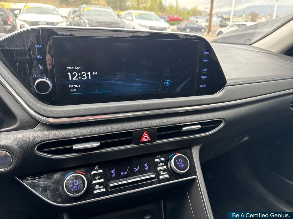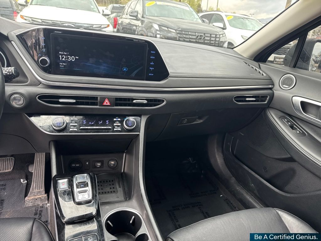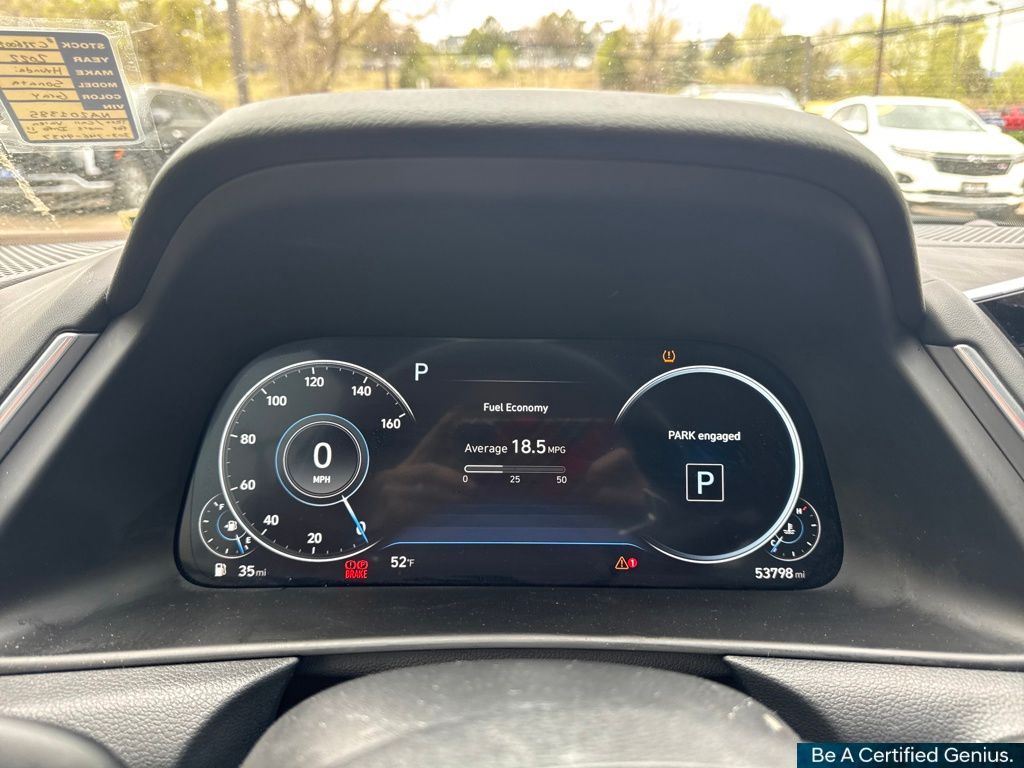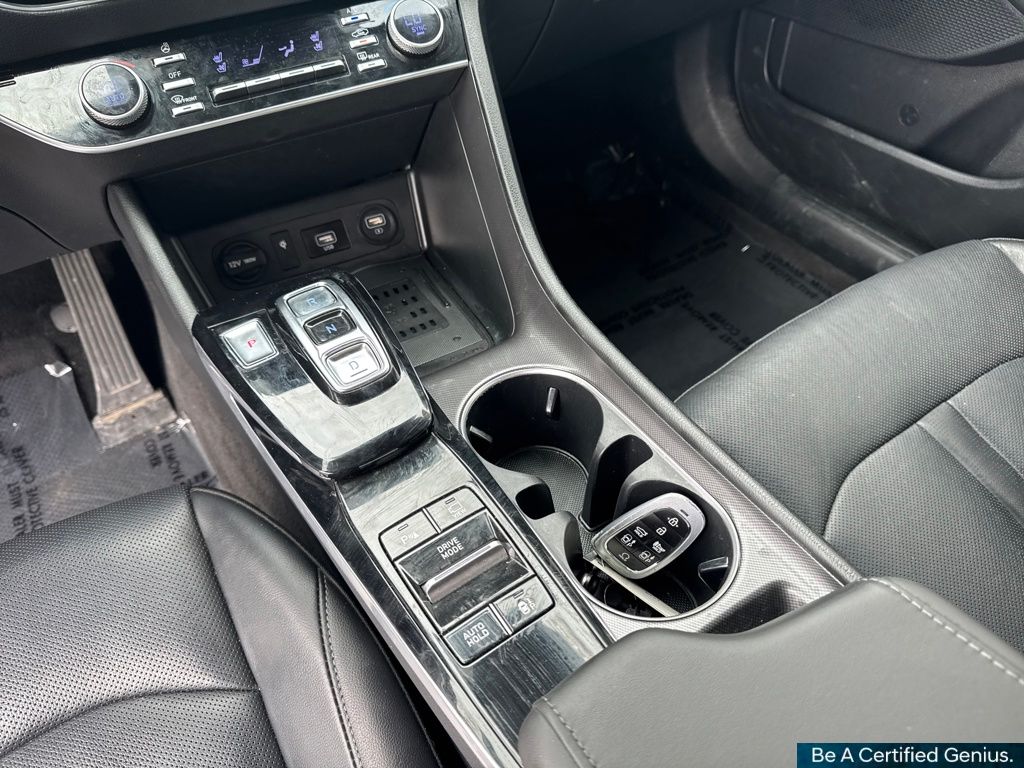 Cargo Package (DISC) (Cargo Hook, Cargo Net, and Reversible Cargo Tray), Option Group 01, Hyundai Certified Used Vehicles Certified, Black Leather, 12 Speakers, 18" x 7.5J Aluminum Alloy Wheels, 4-Wheel Disc Brakes, ABS brakes, Air Conditioning, Alloy wheels, AM/FM radio: SiriusXM, Apple CarPlay & Android Auto, Auto High-beam Headlights, Auto-dimming Rear-View mirror, Automatic temperature control, Brake assist, Bumpers: body-color, Carpeted Floor Mats, Delay-off headlights, Driver door bin, Driver vanity mirror, Dual front impact airbags, Dual front side impact airbags, Electronic Stability Control, Emergency communication system: Blue Link Connected Car Service (3-year complimentary subscription), Four wheel independent suspension, Front anti-roll bar, Front Bucket Seats, Front Center Armrest, Front dual zone A/C, Front reading lights, Fully automatic headlights, Garage door transmitter: HomeLink, Heads-Up Display, Heated door mirrors, Heated front seats, Heated steering wheel, Heated/Ventilated Front Bucket Seats, Illuminated entry, Knee airbag, Leather Seating Surfaces, Leather steering wheel, Low tire pressure warning, Memory seat, Navigation System, Occupant sensing airbag, Outside temperature display, Overhead airbag, Overhead console, Panic alarm, Passenger door bin, Passenger vanity mirror, Power door mirrors, Power driver seat, Power moonroof, Power passenger seat, Power steering, Power windows, Radio data system, Radio: AM/FM/MP3/HD/SiriusXM Display Audio w/Nav, Rain sensing wipers, Rear anti-roll bar, Rear seat center armrest, Rear side impact airbag, Rear window defroster, Remote keyless entry, Security system, Speed control, Speed-sensing steering, Speed-Sensitive Wipers, Split folding rear seat, Steering wheel mounted audio controls, Tachometer, Telescoping steering wheel, Tilt steering wheel, Traction control, Trip computer, Turn signal indicator mirrors, Variably intermittent wipers, and Ventilated front seats.