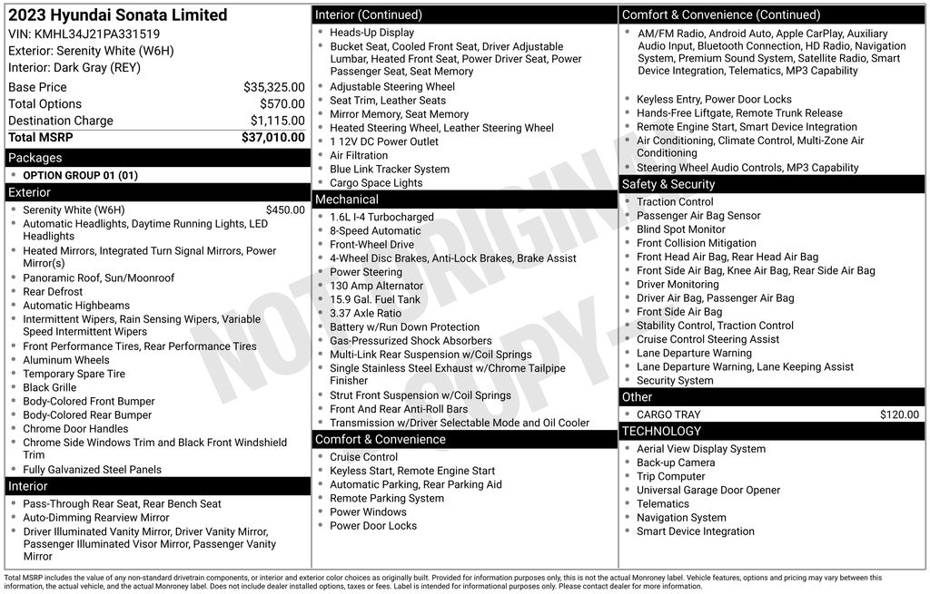 Option Group 01, Dark Gray Leather, 12 Speakers, 18" x 7.5J Aluminum Alloy Wheels, 4-Wheel Disc Brakes, ABS brakes, Air Conditioning, Alloy wheels, AM/FM radio: SiriusXM, Apple CarPlay & Android Auto, Auto High-beam Headlights, Auto-dimming Rear-View mirror, Automatic temperature control, Brake assist, Bumpers: body-color, Cargo Tray, Carpeted Floor Mats, Delay-off headlights, Driver door bin, Driver vanity mirror, Dual front impact airbags, Dual front side impact airbags, Electronic Stability Control, Emergency communication system: Blue Link Connected Car Service (3-year complimentary subscription), Exterior Parking Camera Rear, First Aid Kit, Four wheel independent suspension, Front anti-roll bar, Front Bucket Seats, Front Center Armrest, Front dual zone A/C, Front reading lights, Fully automatic headlights, Garage door transmitter: HomeLink, Heads-Up Display, Heated door mirrors, Heated front seats, Heated steering wheel, Heated/Ventilated Front Bucket Seats, Illuminated entry, Knee airbag, Leather Seating Surfaces, Leather steering wheel, Low tire pressure warning, Memory seat, Mud Guards, Navigation System, Occupant sensing airbag, Outside temperature display, Overhead airbag, Overhead console, Panic alarm, Passenger door bin, Passenger vanity mirror, Power door mirrors, Power driver seat, Power moonroof, Power passenger seat, Power steering, Power windows, Radio data system, Radio: AM/FM/MP3/HD/SiriusXM Display Audio w/Nav, Rain sensing wipers, Rear anti-roll bar, Rear seat center armrest, Rear side impact airbag, Rear window defroster, Remote keyless entry, Security system, Speed control, Speed-sensing steering, Speed-Sensitive Wipers, Split folding rear seat, Steering wheel mounted audio controls, Tachometer, Telescoping steering wheel, Tilt steering wheel, Traction control, Trip computer, Trunk Cargo Net, Turn signal indicator mirrors, Variably intermittent wipers, and Ventilated front seats.