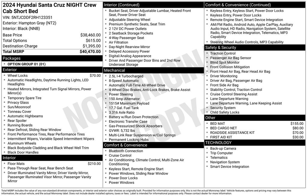 Option Group 01, Hyundai Certified, 3.316 Axle Ratio, 4-Wheel Disc Brakes, 6 Speakers, ABS brakes, Air Conditioning, Alloy wheels, AM/FM radio: SiriusXM, Apple CarPlay & Android Auto, Auto High-beam Headlights, Auto-leveling suspension, Automatic temperature control, Bed Cargo Net, Bed Mat, Brake assist, Bumpers: body-color, Carpeted Floor Mats, Delay-off headlights, Driver door bin, Driver vanity mirror, Dual front impact airbags, Dual front side impact airbags, Electronic Stability Control, Emergency communication system: Bluelink+, Exterior Parking Camera Rear, First Aid Kit, Four wheel independent suspension, Front anti-roll bar, Front Bucket Seats, Front Center Armrest, Front dual zone A/C, Front reading lights, Fully automatic headlights, H-Tex Leatherette Seating Surfaces, Heated door mirrors, Heated Front Bucket Seats, Heated front seats, Illuminated entry, Low tire pressure warning, Navigation System, Occupant sensing airbag, Outside temperature display, Overhead airbag, Overhead console, Panic alarm, Passenger door bin, Passenger vanity mirror, Power door mirrors, Power driver seat, Power moonroof, Power steering, Power windows, Radio data system, Radio: AM/FM/HD Audio System, Rear anti-roll bar, Rear side impact airbag, Rear step bumper, Rear window defroster, Remote keyless entry, Roadside Assistance Kit, Security system, Speed control, Speed-sensing steering, Split folding rear seat, Spoiler, Steering wheel mounted audio controls, Tachometer, Telescoping steering wheel, Tilt steering wheel, Traction control, Trip computer, Turn signal indicator mirrors, Variably intermittent wipers, Wheel Locks, and Wheels: 20" x 7.5J Exclusive Dark Alloy. The strength of Hyundai of Chapel Hills competitive advantage is the result of its ongoing commitment to Philip Long's vision ~ Commitment to the community, quality customer service and exceptional value. Over the years, the Phil Long Group has been a part of the community since 1945! Not only do we support the troops but many more organizations across the state.