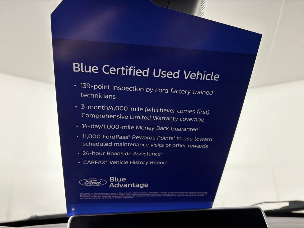 Ford Blue Certified includes:139 point vehicle inspection performed by an ASE Certified technician 3-month/4,000-mile Comprehensive Limited Warranty coverage that is fully competitive with other online retailers Blue Certification includes 11,000 FordPass Rewards Points For other manufacturers not listed above, Comprehensive Coverage is provided for 3 months or 4,000 miles, whichever comes first, from the signature date of the Ford Blue Advantage â" Blue Certified purchase. Comprehensi