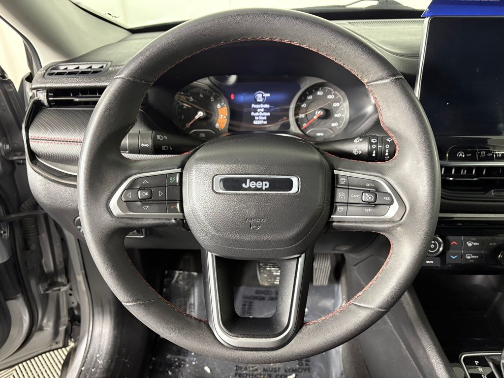 Step inside the Jeep Compass Trailhawk, and youâll find stylish cloth-leather seat upholstery that merges durability with comfort, ideal for both daily commutes and weekend adventures. The adaptive cruise control with traffic stop-go functionality makes long-distance travel a breeze by automatically adjusting speed and maintaining a safe following distance.