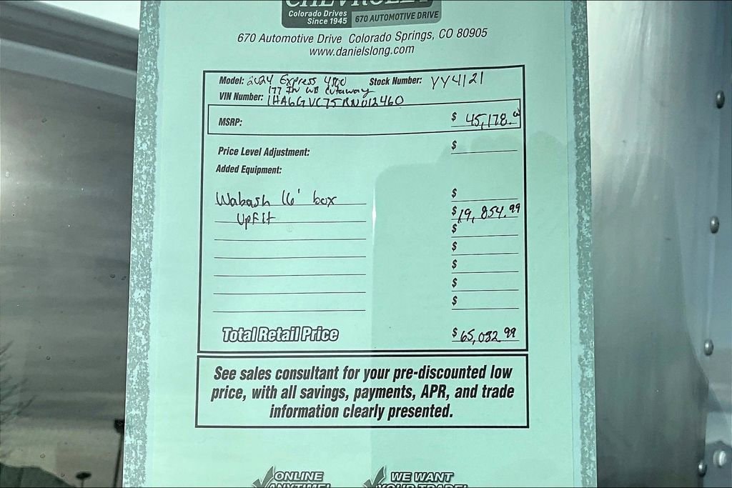 Chrome Appearance Package (Chrome Grille and Front Chrome Bumper w/Step-Pad), Driver Convenience Package (Cruise Control and Tilt Steering Wheel), Power Convenience Package (Power Door Locks w/Lock-Out Protection and Power Windows), Preferred Equipment Group 2WT, 2 Speakers, 4-Wheel Disc Brakes, 4.10 Rear Axle Ratio, ABS brakes, Air Conditioning, AM/FM radio, Antenna Equipment, Body Soft-Mount Donut & Bolt, Delay-off headlights, Driver & Front Passenger High-Back Bucket Seats, Driver door bin, Driver's Seat Mounted Armrest, Dual front impact airbags, Dual Rear Wheel Configuration, Dual rear wheels, Electronic Stability Control, Emergency communication system: OnStar and Chevrolet connected services capable, Engine Cover Console w/Swing-Out Storage Bin, Front anti-roll bar, Front Bucket Seats, Front wheel independent suspension, Fully automatic headlights, Heavy-Duty Locking Rear Differential, Inside Rearview Mirror w/Rr Vision Camera Display, Manual Day/Night Inside Rear-View Mirror, Occupant sensing airbag, Passenger cancellable airbag, Passenger door bin, Passenger seat mounted armrest, Power steering, Radio: AM/FM Stereo w/MP3 Player & Digital Clock, Rear Vision Camera, Reclining High-Back Bucket Seats w/Inboard Armrests, Remote Keyless Entry, Tachometer, Theft Alarm Notification, Traction control, Trip computer, Variably intermittent wipers, Vinyl Seat Trim, Voltmeter, Wheels: 16 x 6.5 8-Lug Painted Steel HD (6), and Wide-Stance Sail Panel Mounted Outside Mirrors. Price includes: $1500 - Customer Cash. Exp. 01/02/2026