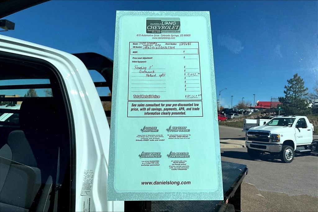 Preferred Equipment Group 1WT, Snow Plow Prep Package (3' Auxiliary Harness For Headlamps & Turn Signals and Provision For Cab Roof Mounted Lamp/Beacon), Snow Plow Prep Package w/Dual Alternators, Vocational Specific Heavy Suspension Package, 10-Way Power Driver's Seat Adjuster, 110-Volt AC Power Outlet, 34,000 lbs. GCWR (15,422 kg), 4.2 Diagonal Color Display Driver Info Center, 4.30 Rear Axle Ratio, 40/20/40 Front 3-Passenger Split Bench Seat, 40/20/40 Front 3-Passenger Split Bench Seat w/Jet Blk, 5 Gallons Additional Fuel, 6-Speaker Audio System, ABS brakes, Air Conditioning, Aluminum Assist Steps, Black Frame-Mounted Front Recovery Hooks, Chrome Front Bumper, Chrome Grille, Delay-off headlights, Driver door bin, Dual front impact airbags, Dual front side impact airbags, Dual rear wheels, Electronic Stability Control, Engine Block Heater, Exterior Parking Camera Rear, Front Center Armrest w/Storage, Front License Plate Kit, Front reading lights, Frontal Passenger-Side Airbag Deactivation Switch, Fully automatic headlights, Leather Wrapped Steering Wheel, Limited-Slip Axle, Occupant sensing airbag, OnStar & Chevrolet Connected Services Capable, Overhead airbag, Overhead console, Passenger cancellable airbag, Passenger door bin, Power steering, Power Take-Off Engine Control Provisions, Power Windows w/Driver Express Up & Down, Premium audio system: Chevrolet MyLink, Radio: AM/FM Stereo w/8 Diagonal Color Touch Screen, Remote Keyless Entry, Single-Slot CD/MP3 Player, Single-Zone Air Conditioning, Speed control, Steel Frame-Mounted Skid Plate, Steering Wheel Audio Controls, Tachometer, Tilt steering wheel, Tool Kit w/Rim Wrench & Handle Only, Top Post Threaded Battery Jump Start Stud, Traction control, Trip computer, Variably intermittent wipers, Voltmeter, Wheels: 19.5 x 6.75 Black Painted Hub Piloted Steel w/8-Holes, and Wheels: 19.5 x 6.75 Hub Piloted 4-Alum w/8-Holes. Price includes: $11500 - Customer Cash. Exp. 03/31/2026