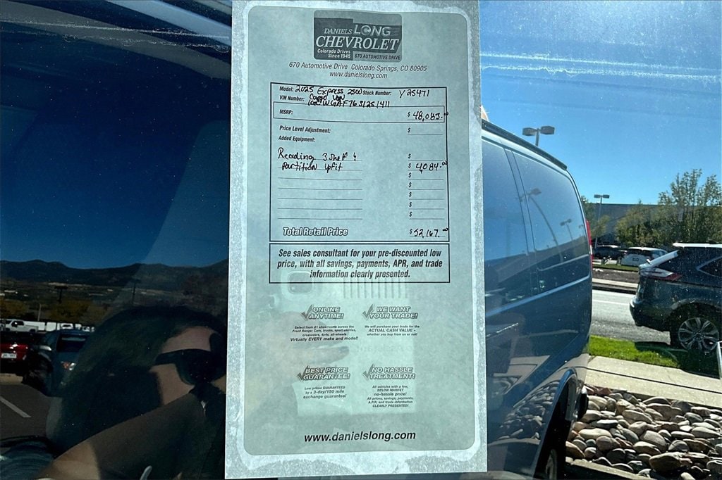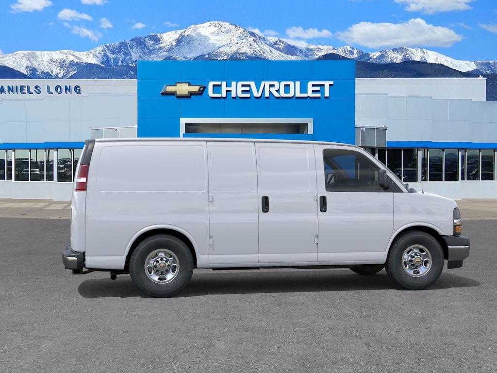 Limited Lifetime Powertrain Warranty included!Summit White 2025 Chevrolet Express 2500 Work Van Cargo RWD Automatic with Overdrive 6.6L V8DANIELS LONG CHEVROLET will beat any local written offer by $500. See Dealer for details..Chrome Appearance Package (Chrome Grille and Front & Rear Chrome Bumpers w/Step-Pad), Driver Convenience Package (Cruise Control and Tilt Steering Wheel), Heavy-Duty Trailering Equipment, Preferred Equipment Group 1WT, 150 Amp Alternator, 16 x 6.5 Steel Wheels, 2 Speakers, 3.42 Rear Axle Ratio, 4-Wheel Disc Brakes, ABS brakes, Air Conditioning, AM/FM radio, AM/FM Stereo w/MP3 Player, Delay-off headlights, Driver & Front Passenger High-Back Bucket Seats, Driver & Front Passenger Vinyl Visors, Driver door bin, Driver's Seat Mounted Armrest, Dual front impact airbags, Dual front side impact airbags, Electronic Stability Control, Engine Cover Console w/Swing-Out Storage Bin, Exterior Parking Camera Rear, Front anti-roll bar, Front Bucket Seats, Front Reclining High-Back Bucket Seats, Front wheel independent suspension, Full-Length Black Rubberized-Vinyl Floor Covering, Fully automatic headlights, Heated door mirrors, Heavy-Duty Rear Locking Differential, Low tire pressure warning, Occupant sensing airbag, Overhead airbag, Passenger cancellable airbag, Passenger door bin, Passenger seat mounted armrest, Power door mirrors, Power steering, Power windows, Rear Park Assist, Reclining Front Bucket Seats w/Inboard Armrests, Remote Keyless Entry, Side Blind Zone Alert, Single-Zone Manual Air Conditioning, Tachometer, Theft Alarm Notification, Traction control, Trip computer, Variably intermittent wipers, Vinyl Seat Trim, and Voltmeter.