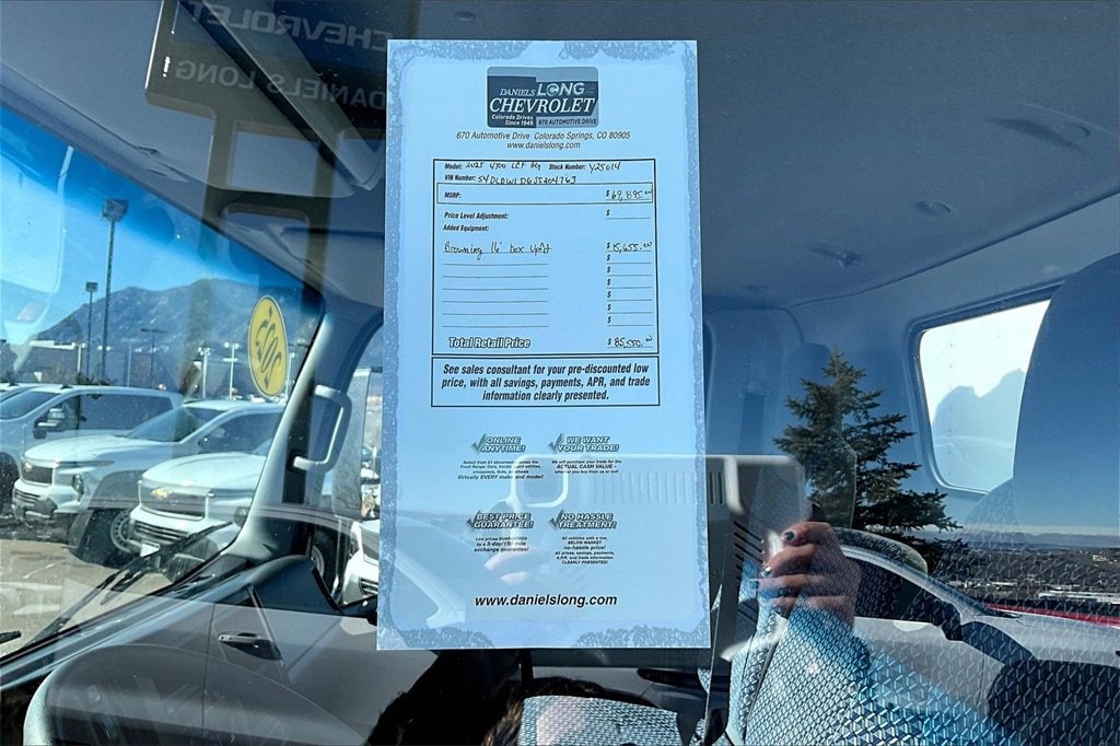 Preferred Equipment Group 1WT, 19.5 x 6 Steel Wheels, 2 Speakers, 2 Speakers Audio System Feature, 4-Wheel Disc Brakes, ABS brakes, Air Conditioning, AM/FM radio, Bumpers: body-color, CD player, Driver door bin, Dual rear wheels, Front anti-roll bar, Front Bucket Seats, Front Center Armrest, High Back Front Bucket Seats, Limited-Slip Axle, Overhead console, Passenger door bin, Power steering, Power windows, Radio: AM/FM Stereo w/CD Player & Bluetooth, Rear Dome & Body Lamp Switch, Remote Keyless Entry, Single-Zone Manual Air Conditioning, Speed control, Tachometer, Telescoping steering wheel, Tilt steering wheel, Tricot Cloth Seat Trim, and Trip computer. Price includes: $1750 - Customer Cash. Exp. 01/02/2026
