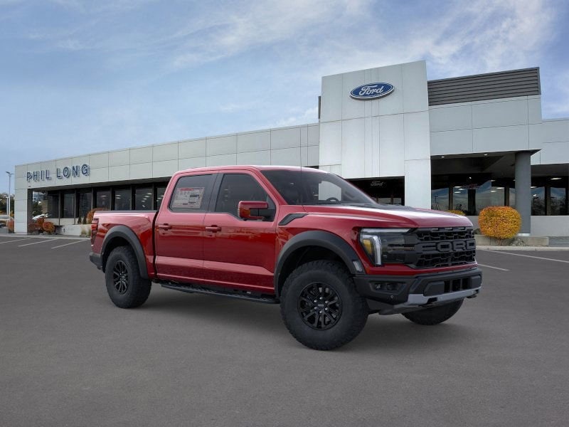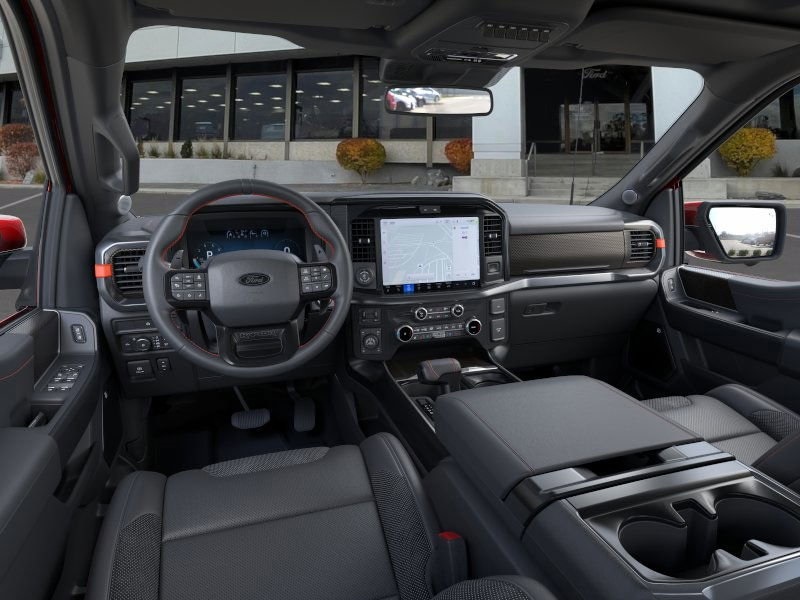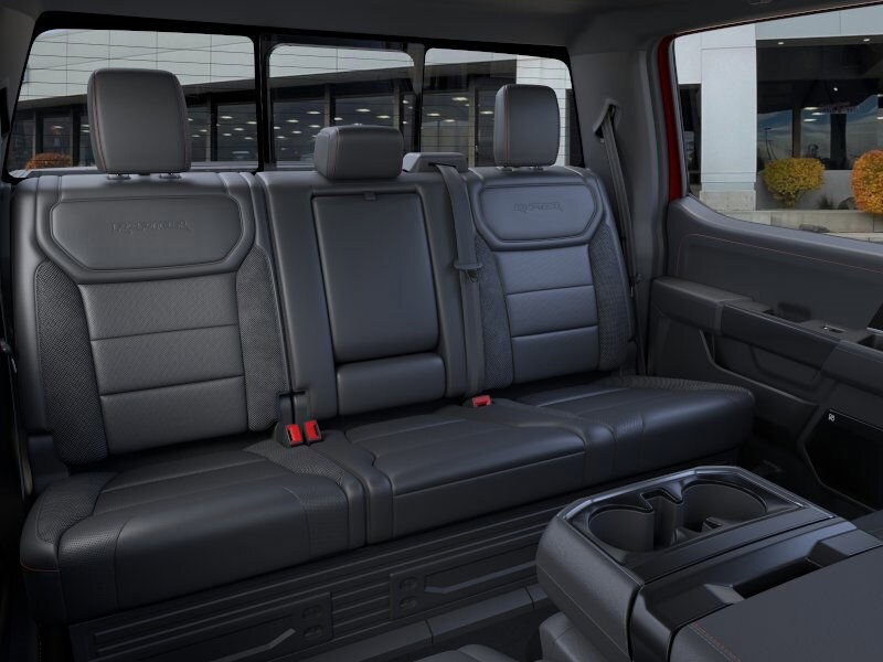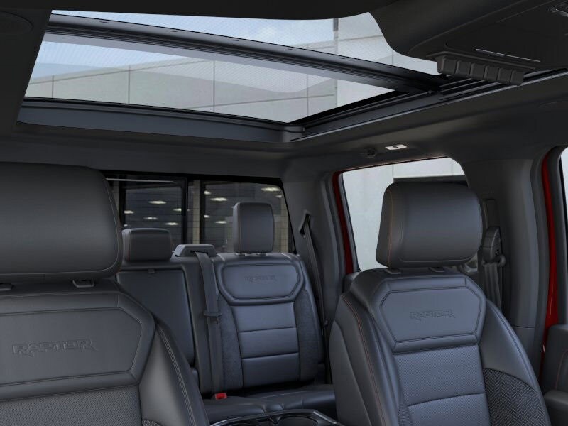 TWIN PANEL MOONROOF, TOUGH BED SPRAY-IN BEDLINER, TRANSMISSION: ELECTRONIC 10-SPEED AUTOMATIC SelectShift w/paddle shifters and terrain management modes: normal, sport, tow-haul, slippery, rock crawl, off-road and baja (STD). Ford Raptor with Rapid Red Metallic Tinted Clearcoat exterior and Black interior features a V6 Cylinder Engine with 450 HP at 5250 RPM*.