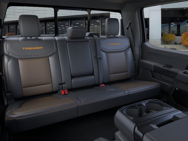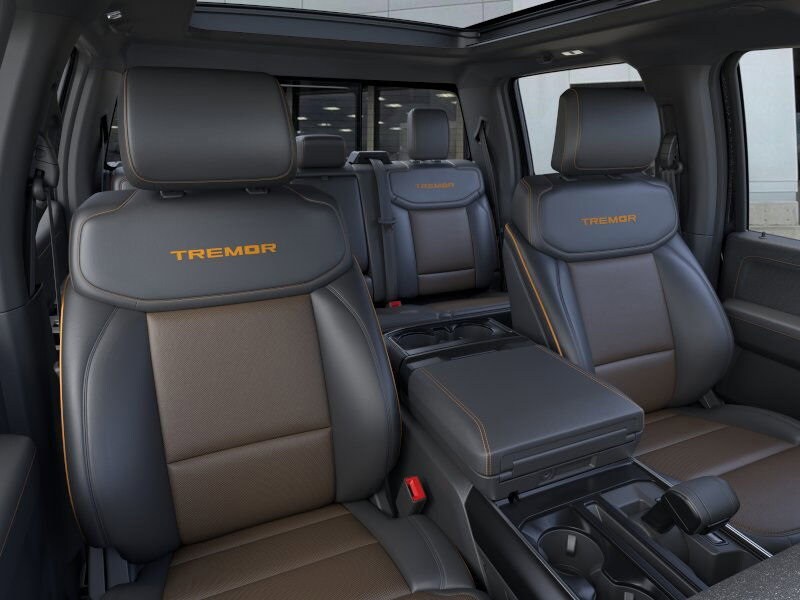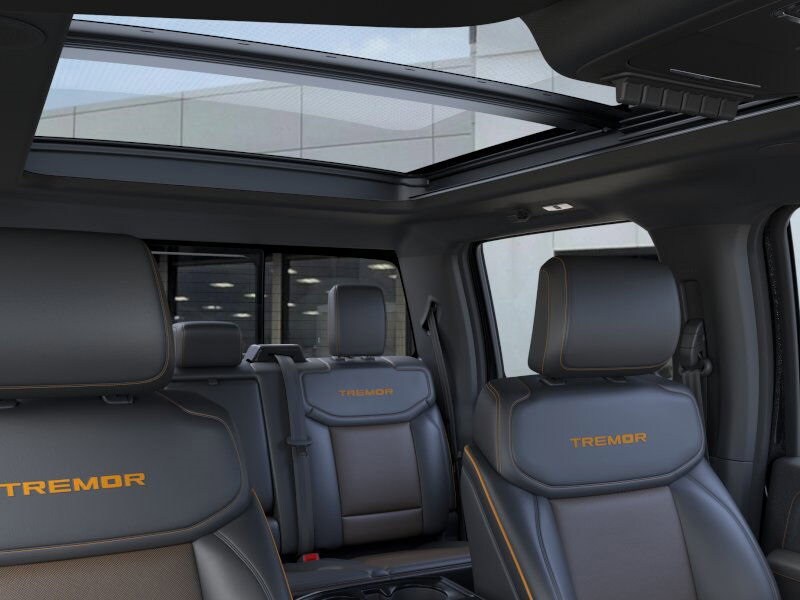 EQUIPMENT GROUP 402A HIGH Power-Adjustable Pedals w/Memory, Bed Utility Package, Tailgate Step w/Tailgate Work Surface, LED Box Lighting, Power Tailgate, 4 Pickup Box Tie-Down Plates, Premium Wrapped Steering Wheel, Modular Front Bumper & Carbon Black Rear Bumper, Mobile Office Package, Wireless Charging, Partitioned Lockable Rear Storage, Console Worksurface, Media Bin Door, Hi-Lock Transfer Case, Power Glass Heated Sideview Mirrors, power-folding, turn signal, auto-dimming feature (drivers side), high-intensity LED security approach lamps, LED sideview mirror spotlights and body-color skull caps, Auto-Dimming Rearview Mirror, Ambient Lighting, LED Taillamps, Two-Speed Automatic AWD w/Mechanical Locking 4WD, Radio: B&O Unleashed Sound System by Bang & Olufsen, HD Radio and 14 speakers, TWIN PANEL MOONROOF, TOUGH BED SPRAY-IN BEDLINER, TRANSMISSION: ELECTRONIC 10-SPEED AUTOMATIC SelectShift w/progressive range select and selectable drive modes: normal, ECO, sport, tow/haul, slippery, deep snow/sand and mud/rut (STD). Ford Tremor with Agate Black exterior and Black interior features a 8 Cylinder Engine with 400 HP at 6000 RPM*.