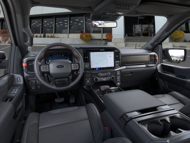 TWIN PANEL MOONROOF, TOUGH BED SPRAY-IN BEDLINER, TRANSMISSION: ELECTRONIC 10-SPEED AUTOMATIC SelectShift w/paddle shifters and terrain management modes: normal, sport, tow-haul, slippery, rock crawl, off-road and baja (STD). Ford Raptor with Agate Black exterior and Black interior features a V6 Cylinder Engine with 450 HP at 5250 RPM*.
