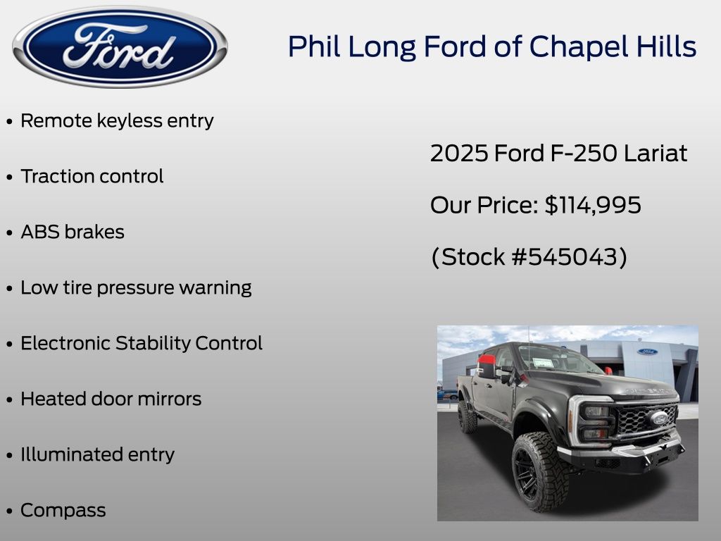 Agate Black Metallic 2025 Ford F-250SD Lariat B.A.T. Design Co. 4WD 10-Speed Automatic 7.3L V8 PFI SOHC 16V Federal 405hp F-250SD Lariat B.A.T. Design Co., 4D Crew Cab, 7.3L V8 PFI SOHC 16V Federal 405hp, 10-Speed Automatic, 4WD, Agate Black Metallic, 5b Black Onyx Premium Synthetic, ABS brakes, Compass, Electronic Stability Control, Heated door mirrors, Illuminated entry, Low tire pressure warning, Remote keyless entry, Traction control.
