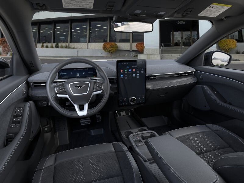 MUSTANG MACH-E RALLY GT logo is removed from the center console lid, clear paint protective film on lower body sides, Mach-E Rally Door Graphics, Replaces standard door badges, RallySport Drive Mode, Replaces unbridle extended, Oxford White Steering Wheel/Door/IP Interior Trim, Ford Performance Front Seats, exclusive debossed logos and oxford white seatback trim, Rallycross-Tuned MagneRide Damping System, Mustang Mach-E GT Performance Upgrade, Door, Wheel, Roof & Bumper Trim, Dark carbonized gray, Wheels: 19 High Gloss Oxford White, black printed graphics, Sport Pedals, Unique Raised Rear Spoiler in Dark Carbonized Gray, Black Painted Steel Roof, Front Aluminum Underbody Protective Shield, Unique Grille Shield in Dark Carbonized Gray, integrated LED fog lamps, Hood & Decklid Stripes, FORD CONNECTIVITY PACKAGE (ONE-TIME PURCHASE) unlimited 5G Wi-Fi hotspot and entertainment (karaoke), Option for a one-time purchase of Ford connectivity package, Ford connectivity package will be active for a minimum of 7 years on this vehicle (non-transferable to another VIN) from warranty start date, Retail modem authorization is required, No additional subscription purchase will be required to maintain connectivity beyond the 7 years if the service is available, Applicable to both one-time and 1-year trial: Evolving technology/cellular networks/vehicle capability may limit functionality and prevent operation of connected features, Data speeds may temporarily be slowed down if network is busy, Cellular Connectivity for Audio/Video Streaming, INTERIOR PROTECTION PACKAGE Pre-installed, Deletes standard front and second row carpeted floor mats, Cargo Floor Liner, Cargo Area Cover, 1st & 2nd Row Floor Liners w/o Carpet Mats, TRANSMISSION: SINGLE SPEED (STD). Ford GT with Shadow Black exterior and Performance Gray w/Metallic Stitching interior features a Electric Motor.