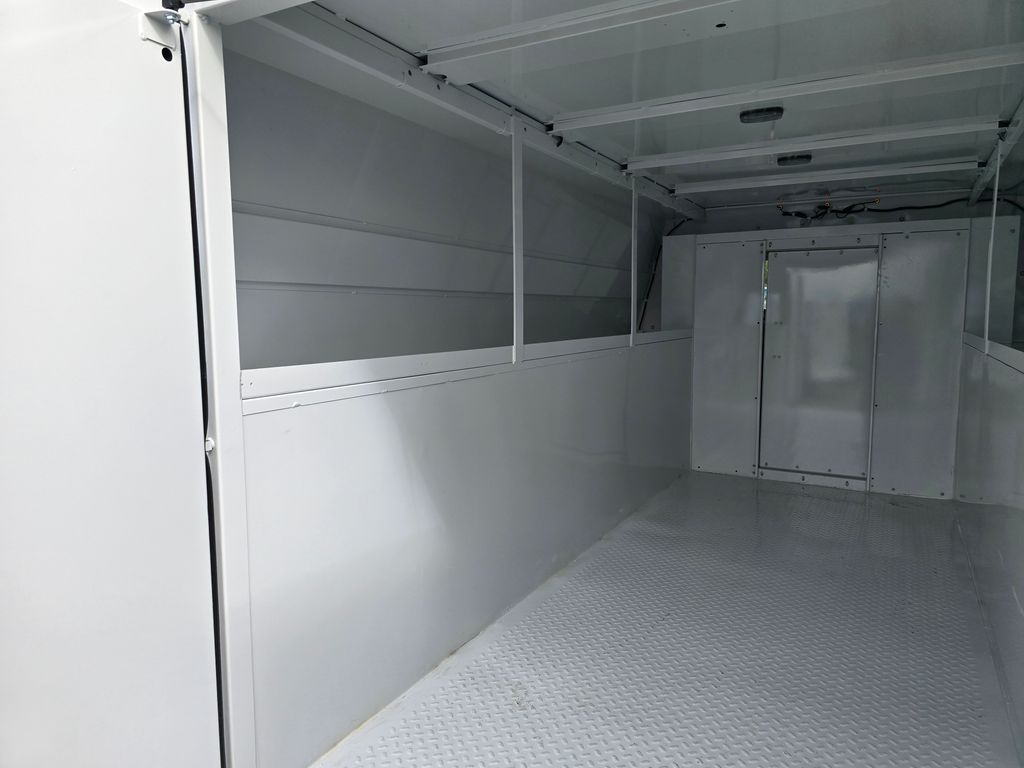 This Ford E-350 Single Rear Wheel cutaway chassis is equipped with a rugged, all-steel Reading RVSL57-132APSW enclosed service body. The body features a 132" length with multiple compartments on both the roadside and curbside, offering ample organized storage.