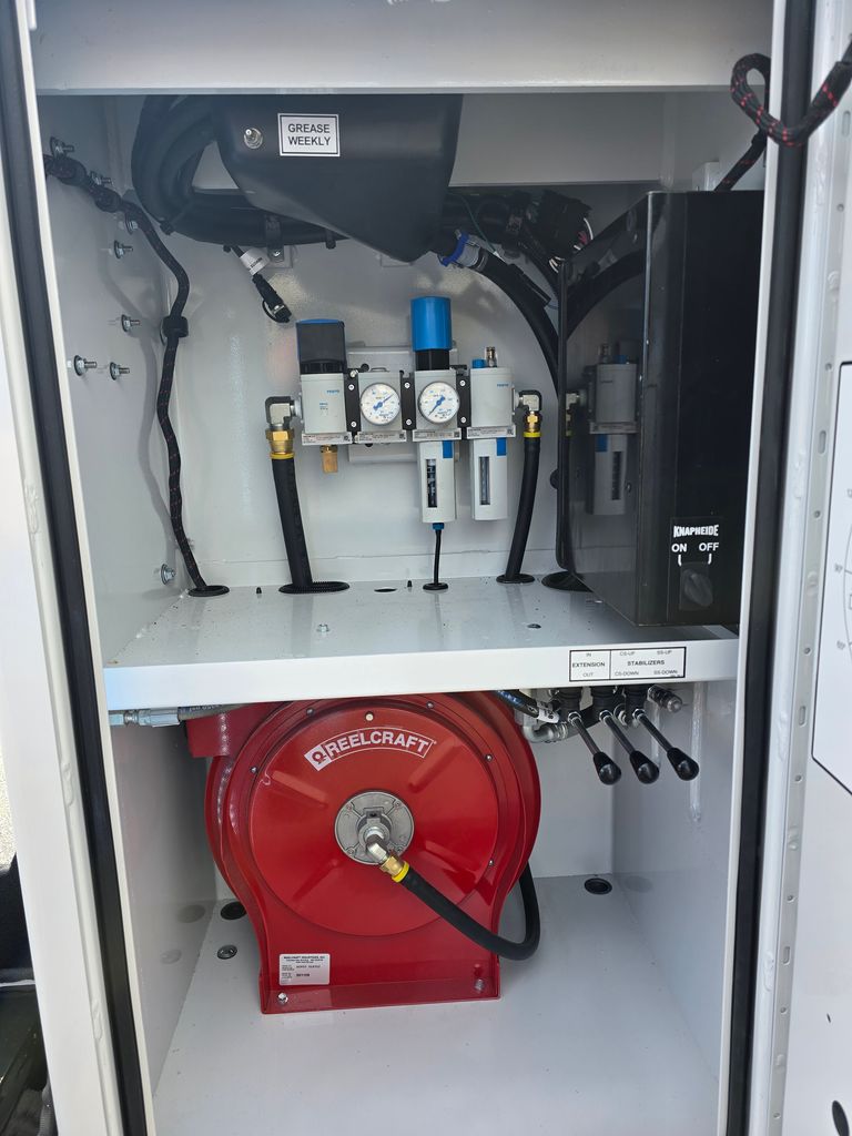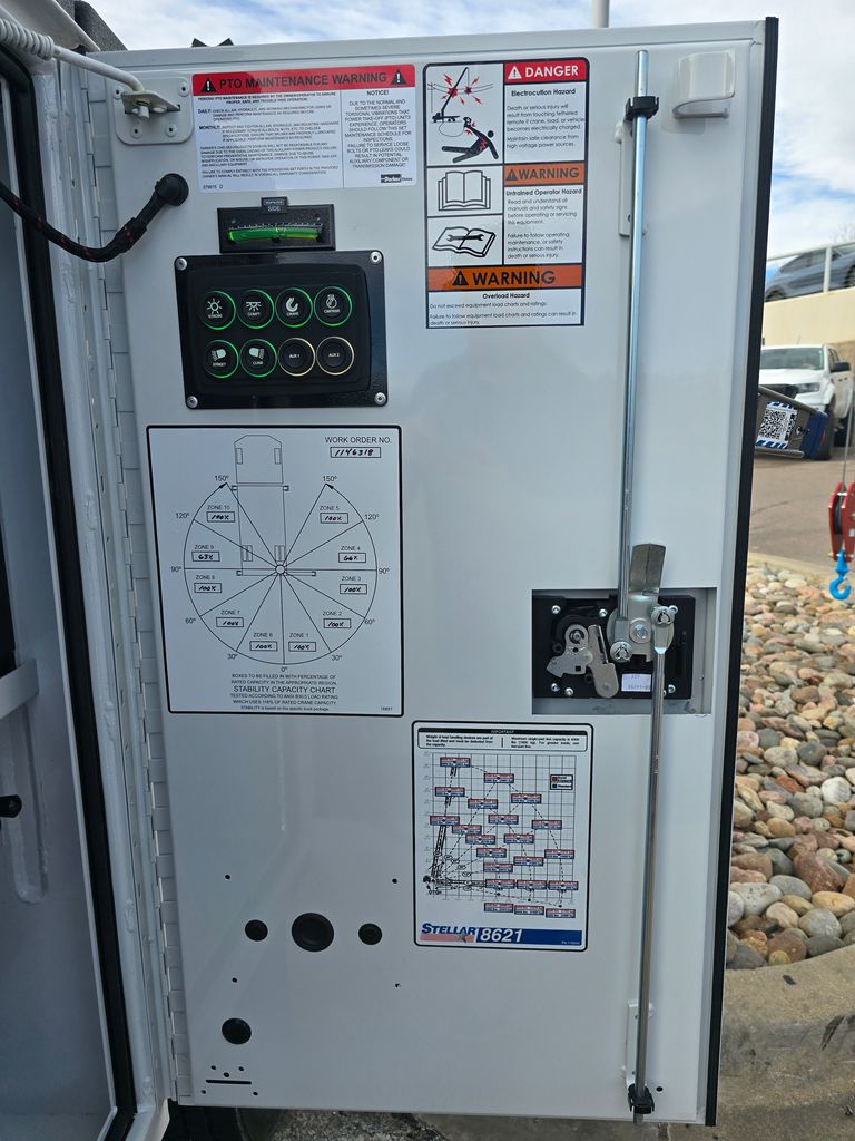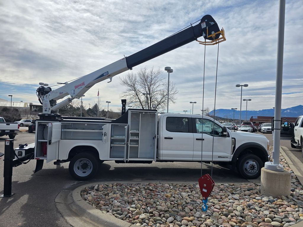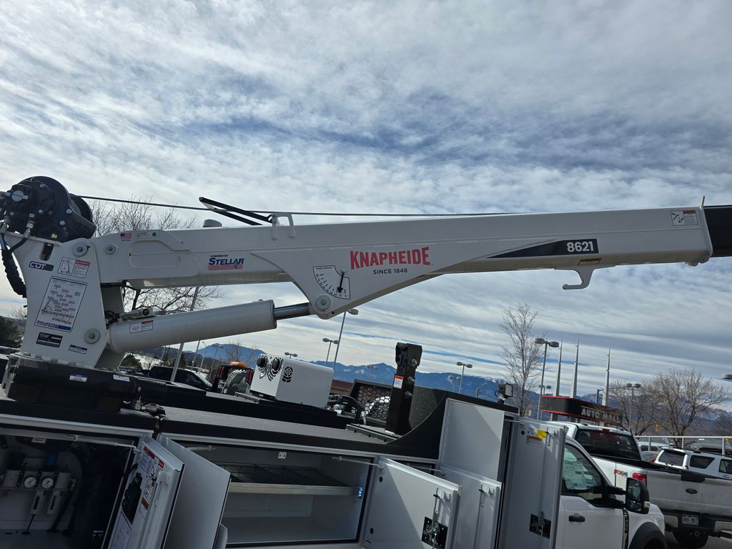 This 2026 Ford F-550 is outfitted with a heavy-duty Knapheide KMT1-11R 11-foot crane body, engineered for serious lifting and utility work. The centerpiece of this upfit is a Stellar 8621 crane, complemented by a hydraulic air compressor with a retractable hose reel and a 35-gallon hydraulic oil reservoir. The body is equipped with hydraulic rear outriggers for stability, a KMT control system with an in-cab display, and extensive compartment storage including a 7-drawer unit with adjustable shelving. Additional features include LED compartment lights, a backup alarm, grill strobes, a 7-way trailer plug, rear mud flaps, and a commercial-grade spray-on bed liner. The body is finished in single-stage white paint and includes a Chelsea PTO installation and a weight slip, making this truck a fully equipped solution for demanding commercial applications.
