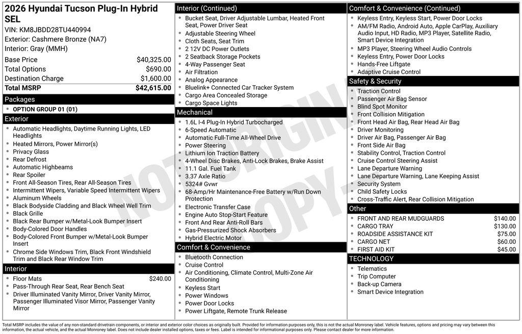 Cashmere Bronze 2026 Hyundai Tucson Plug-In Hybrid SEL AWD 6-Speed Automatic 1.6L I4 DGI Hybrid Turbocharged DOHC 16V LEV3-SULEV30