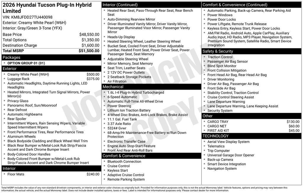 Creamy White Pearl 2026 Hyundai Tucson Plug-In Hybrid Limited AWD 6-Speed Automatic 1.6L I4 DGI Hybrid Turbocharged DOHC 16V LEV3-SULEV30