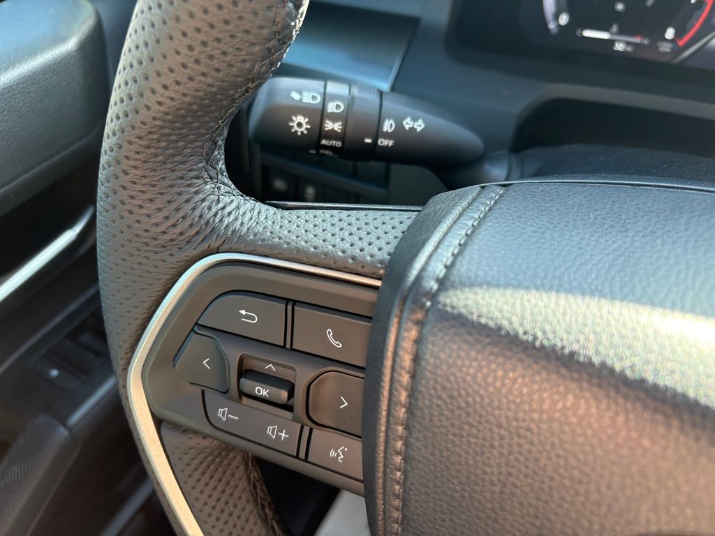 - Leather-trimmed manual tilt/telescopic steering wheel with phone, audio, display/infotainment, and driver assist controls.