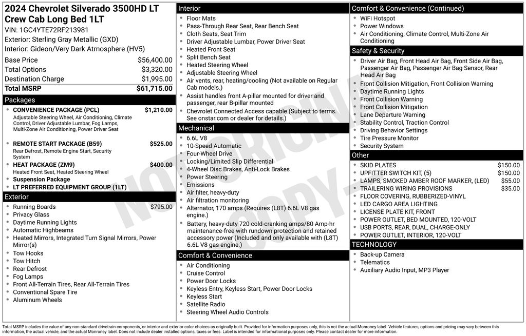 Convenience Package (10-Way Power Driver Seat Adjuster w/Lumbar, 120-Volt Bed Mounted Power Outlet, 120-Volt Interior Power Outlet, Dual Rear USB Ports (Charge Only), Dual-Zone Automatic Climate Control, Front LED Fog Lamps, LED Cargo Area Lighting, and Manual Tilt-Wheel/Telescoping Steering Column), Heat Package (Heated Driver & Front Outboard Passenger Seats and Heated Steering Wheel), Preferred Equipment Group 1LT (170 Amp Alternator, 2-Speed Electronic Shift Transfer Case, 4-Way Manual Driver Seat Adjuster, Black Mirror Caps, Bluetooth® For Phone, Chevrolet Connected Access Capable, Color-Keyed Carpeting Floor Covering, Compass Located In Instrument Cluster, Deep-Tinted Glass, EZ Lift Power Lock & Release Tailgate, Front Rubberized Vinyl Floor Mats, Halogen Reflector Headlamps, HD Rear Vision Camera, Keyless Open & Start, Manual Tilt-Wheel Steering Column, OnStar & Chevrolet Connected Services Capable, Outside Power-Adjustable Mirrors, Power Door Locks, Power Front Windows w/Driver Express Up/Down, Power Front Windows w/Passenger Express Down, Power Rear Windows w/Express Down, Push Button Start, Rear 60/40 Folding Bench Seat (Folds Up), Rear Rubberized-Vinyl Floor Mats, SiriusXM w/360L, Standard Tailgate, Steering Wheel Audio Controls, Steering Wheel Mounted Electronic Cruise Control, Wi-Fi Hotspot Capable, and Wrapped Steering Wheel), Remote Start Package (Electric Rear-Window Defogger, Remote Vehicle Starter System, and Unauthorized Entry Theft-Deterrent System), Suspension Package, 10-Speed Automatic, 4WD, Gideon/Very Dark Atmosphere Cloth, 3.73 Rear Axle Ratio, 4-Way Manual Passenger Seat Adjuster, 4-Wheel Disc Brakes, 6 Speakers, 6-Speaker Audio System Feature, 6" Rectangular Chromed Tubular Assist Steps, ABS brakes, Air Conditioning, AM/FM radio: SiriusXM with 360L, Apple CarPlay/Android Auto, Auto High-beam Headlights, Brake assist, Bumpers: chrome, Cloth Seat Trim, Compass, Delay-off headlights, Driver door bin, Driver vanity mirror, Dual front impact airbags, Dual front side impact airbags, Durabed Pickup Bed, Electronic Stability Control, Front 40/20/40 Split-Bench Seats w/Lockable Storage, Front anti-roll bar, Front Center Armrest w/Storage, Front License Plate Kit, Front reading lights, Front wheel independent suspension, Fully automatic headlights, Heated door mirrors, Heavy-Duty 80 Amp-Hr Battery, Illuminated entry, Low tire pressure warning, Occupant sensing airbag, Outside temperature display, Overhead airbag, Overhead console, Panic alarm, Passenger door bin, Passenger vanity mirror, Power door mirrors, Power steering, Power windows, Premium audio system: Chevrolet Infotainment 3 Premium, Radio: Chevrolet Infotainment 3 Premium System, Rear reading lights, Rear step bumper, Remote keyless entry, Rubberized-Vinyl Floor Covering, Speed control, Split folding rear seat, Steering wheel mounted audio controls, Tachometer, Tilt steering wheel, Traction control, Trip computer, Turn signal indicator mirrors, Upfitter Switch Kit (5), Variably intermittent wipers, and Voltmeter.