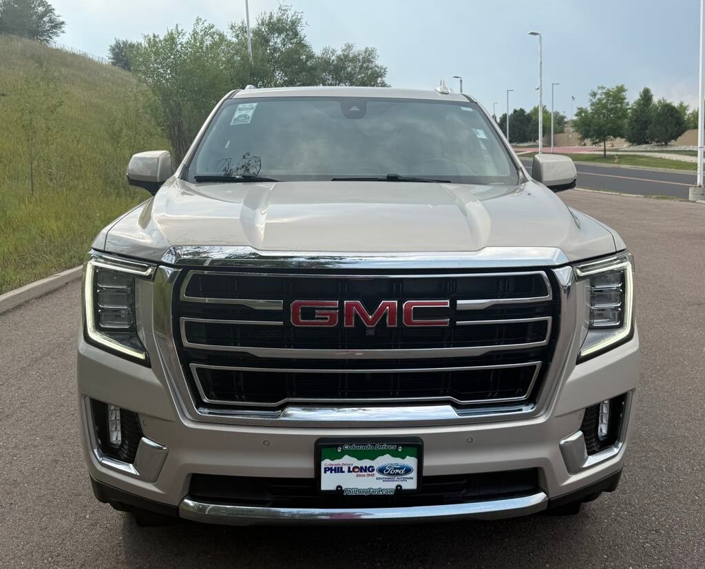 License Plate Front Mounting Package, Max Trailering Package, Preferred Equipment Group 4SA (2 Presets For Power Driver Seat, Automatic Stop/Start, Bose 9-Speaker Stereo Audio System Feature, Bright Chrome Bodyside Moldings, Bright Front & Rear Door Sill Plates, Chrome Door Handles w/Body-Color Strip, Hands-Free Power Programmable Rear Liftgate, Heated & Ventilated Driver & Front Passenger Seats, Heated Driver & Front Passenger Seats, Inside Rear-View Auto-Dimming Mirror, Safety Alert Seat, Start/Stop System Disable Button, Universal Home Remote, and Wireless Charging), SLT Luxury Package (2 Presets For Outside Rearview Mirrors, 3rd Row 60/40 Power-Folding Split-Bench Seat, HD Surround Vision, Heated 2nd Row Outboard Position Seats, Heated Steering Wheel, Outside Heated Power-Adjustable Mirrors, Power Release 2nd Row 60/40 Split-Folding Bench Seat, Power Tilt & Telescopic Steering Column, and Rear Pedestrian Alert), 4WD, 3.23 Rear Axle Ratio, 3rd row seats: split-bench, 4-Wheel Disc Brakes, 9 Speakers, ABS brakes, Air Conditioning, All-Weather Cargo Mat (LPO), Alloy wheels, AM/FM radio: SiriusXM with 360L, AM/FM Stereo, Apple CarPlay/Android Auto, Auto High-beam Headlights, Auto-dimming Rear-View mirror, Automatic Emergency Braking, Automatic temperature control, Bodyside moldings, Brake assist, Bumpers: body-color, Compass, Delay-off headlights, Driver door bin, Driver vanity mirror, Dual front impact airbags, Dual front side impact airbags, Electronic Stability Control, Emergency communication system: OnStar and GMC Connected Services capable, Extra Capacity Cooling System, Following Distance Indicator, Forward Collision Alert, Four wheel independent suspension, Front & Rear Park Assist, Front anti-roll bar, Front Bucket Seats, Front Center Armrest, Front dual zone A/C, Front fog lights, Front Pedestrian Braking, Front reading lights, Fully automatic headlights, Garage door transmitter, Heated door mirrors, Heated front seats, Hitch Guidance w/Hitch View, Illuminated entry, Integrated Trailer Brake Controller, IntelliBeam Automatic High Beam On/Off, Lane Change Alert w/Side Blind Zone Alert, Lane Keep Assist w/Lane Departure Warning, Leather steering wheel, Low tire pressure warning, Memory seat, Navigation System, Not Equipped w/4-Way Driver & Fr Pass Pwr Lumbar, Not Equipped w/Heated Steering Wheel (DISC), Not Equipped w/Steering Column Lock, Occupant sensing airbag, Outside temperature display, Overhead airbag, Overhead console, Panic alarm, Passenger door bin, Passenger vanity mirror, Perforated Leather-Appointed Seating, Power door mirrors, Power driver seat, Power Liftgate, Power passenger seat, Power steering, Power windows, Premium Smooth Ride Suspension, Rain sensing wipers, Rear air conditioning, Rear anti-roll bar, Rear Cross Traffic Alert, Rear reading lights, Rear seat center armrest, Rear window defroster, Rear window wiper, Remote keyless entry, Roof rack: rails only, Security system, SiriusXM w/360L, Smart Trailer Integration Indicator, Speed control, Speed-sensing steering, Split folding rear seat, Spoiler, Steering wheel mounted audio controls, Tachometer, Telescoping steering wheel, Tilt steering wheel, Traction control, Trailer Side Blind Zone Ale