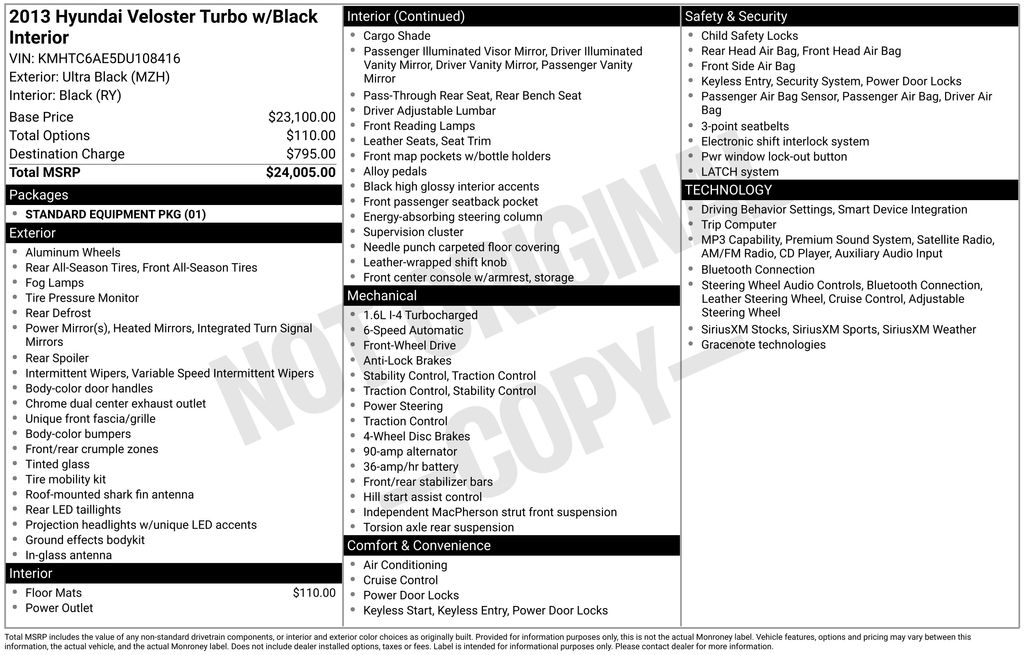 Ultra Black Pearl 2013 Hyundai Veloster Turbo w/Black FWD 6-Speed Automatic with Shiftronic 1.6L I4 DGI DOHC 16V Turbocharged 24/31 City/Highway MPG