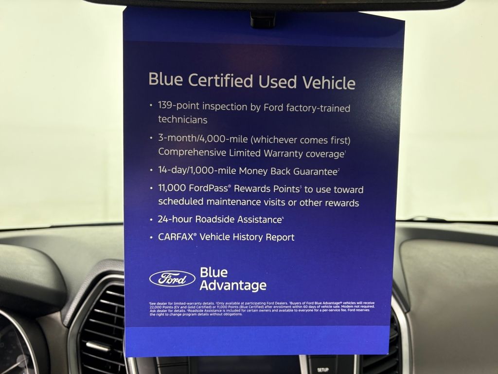 139 point vehicle inspection performed by an ASE Certified technician 3-month/4,000-mile Comprehensive Limited Warranty coverage that is fully competitive with other online retailers Blue Certification includes 11,000 FordPass Rewards Points For other manufacturers not listed above, Comprehensive Coverage is provided for 3 months or 4,000 miles, whichever comes first, from the signature date of the Ford Blue Advantage â€" Blue Certified purchase. Comprehensive Limited Warranty covering 1,000+ components Travel expense reimbursement Rental car reimbursement SiriusXM 3 month tria. Recent Arrival! 20/26 City/Highway MPG