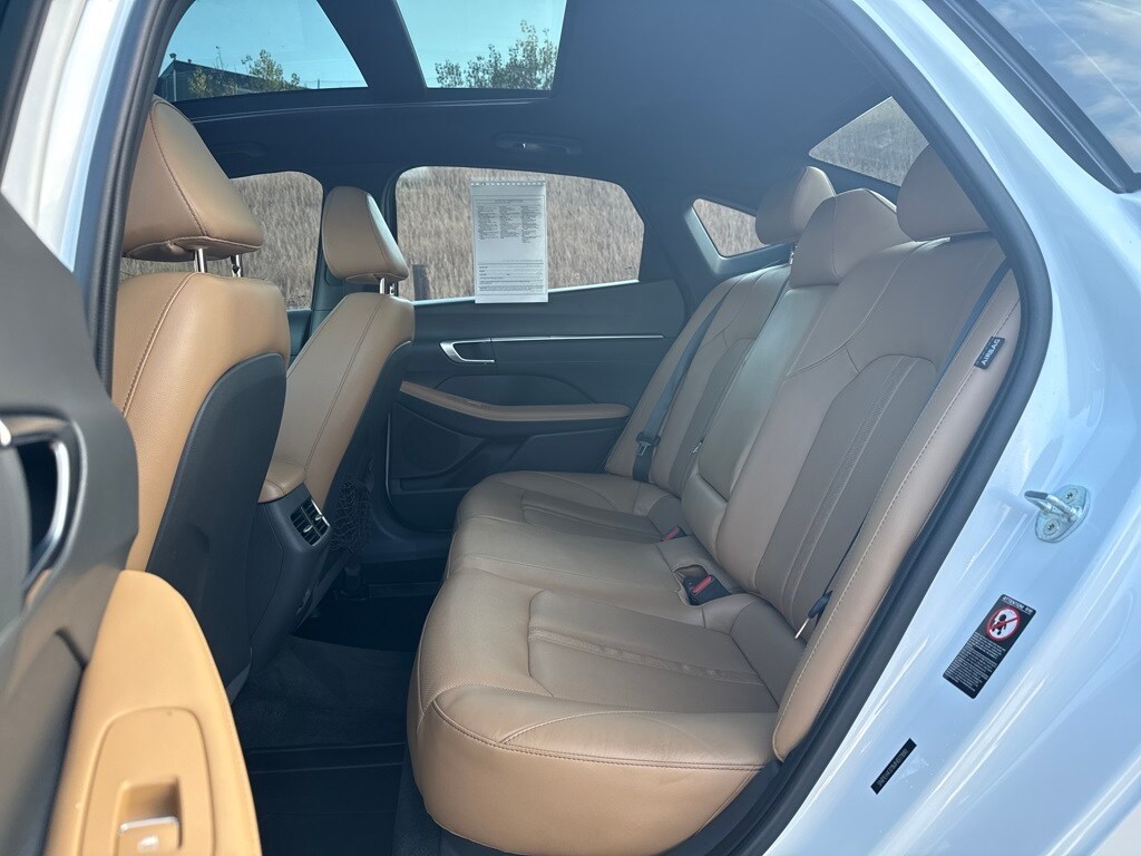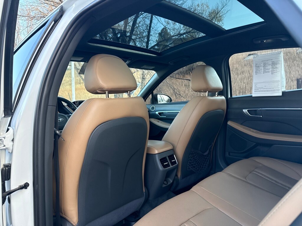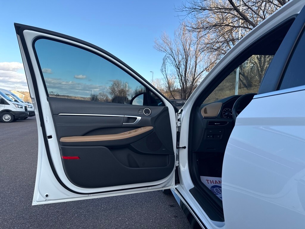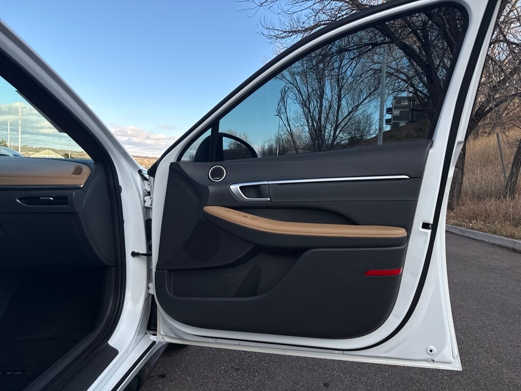 Option Group 01, Dark Gray/Camel Leather, 12 Speakers, 4-Wheel Disc Brakes, ABS brakes, Air Conditioning, Alloy wheels, AM/FM radio: SiriusXM, Apple CarPlay & Android Auto, Auto High-beam Headlights, Auto-dimming Rear-View mirror, Automatic temperature control, Bose Premium Audio, Brake assist, Bumpers: body-color, Cargo Net, Carpeted Floor Mats, Delay-off headlights, Driver door bin, Driver vanity mirror, Dual front impact airbags, Dual front side impact airbags, Electronic Stability Control, Emergency communication system: Blue Link Connected Car Service (3-year complimentary subscription), First Aid Kit, Four wheel independent suspension, Front anti-roll bar, Front Bucket Seats, Front Center Armrest, Front dual zone A/C, Front reading lights, Fully automatic headlights, Garage door transmitter: HomeLink, Heads-Up Display, Heated door mirrors, Heated front seats, Heated steering wheel, Heated/Ventilated Front Bucket Seats, Illuminated entry, Knee airbag, Leather Seating Surfaces, Low tire pressure warning, Memory seat, Navigation System, Occupant sensing airbag, Outside temperature display, Overhead airbag, Overhead console, Panic alarm, Passenger door bin, Passenger vanity mirror, Power door mirrors, Power driver seat, Power moonroof, Power passenger seat, Power steering, Power windows, Radio data system, Radio: AM/FM/MP3/HD/SiriusXM Display Audio w/Nav, Rain sensing wipers, Rear anti-roll bar, Rear Bumper Applique, Rear seat center armrest, Rear side impact airbag, Rear window defroster, Remote keyless entry, Security system, Speed control, Speed-sensing steering, Speed-Sensitive Wipers, Split folding rear seat, Steering wheel mounted audio controls, Tachometer, Telescoping steering wheel, Tilt steering wheel, Traction control, Trip computer, Turn signal indicator mirrors, Variably intermittent wipers, Ventilated front seats, Wheel Locks, Wheels: 18 x 7.5J Aluminum Alloy, and Wireless Device Charging.