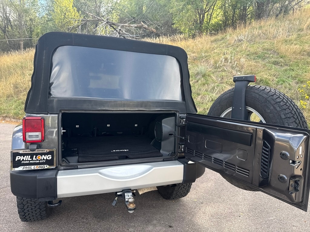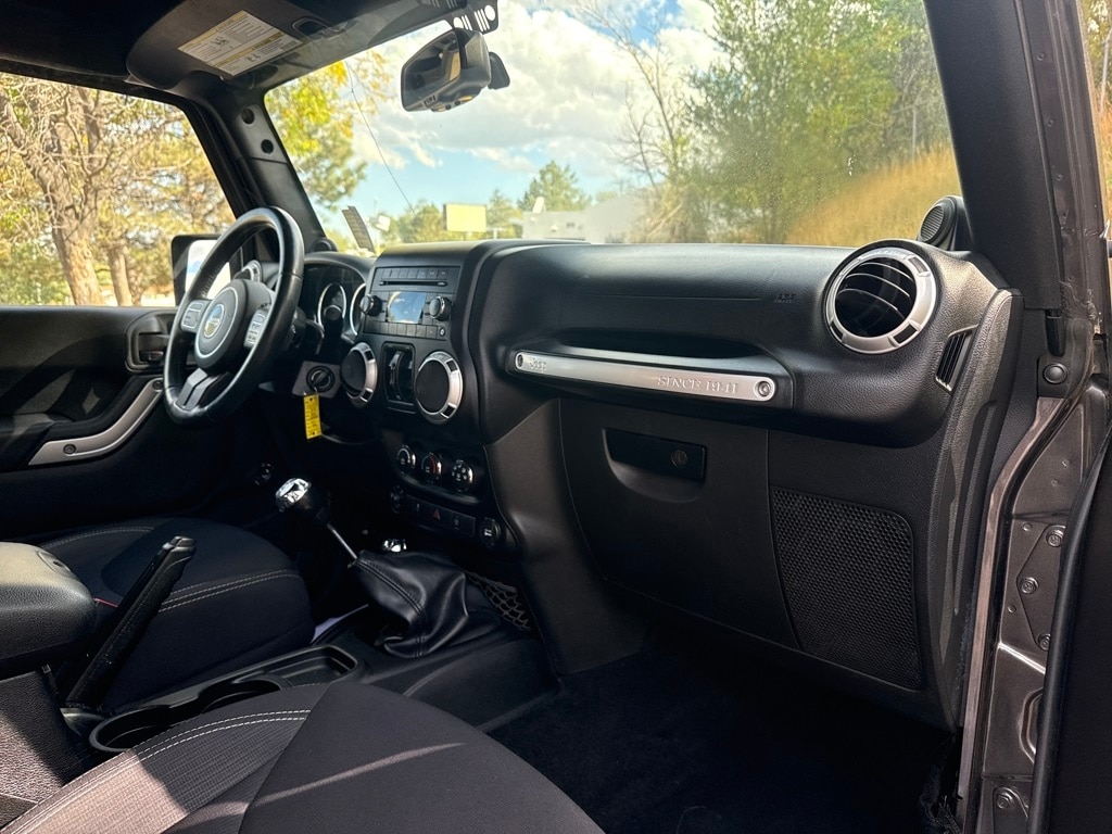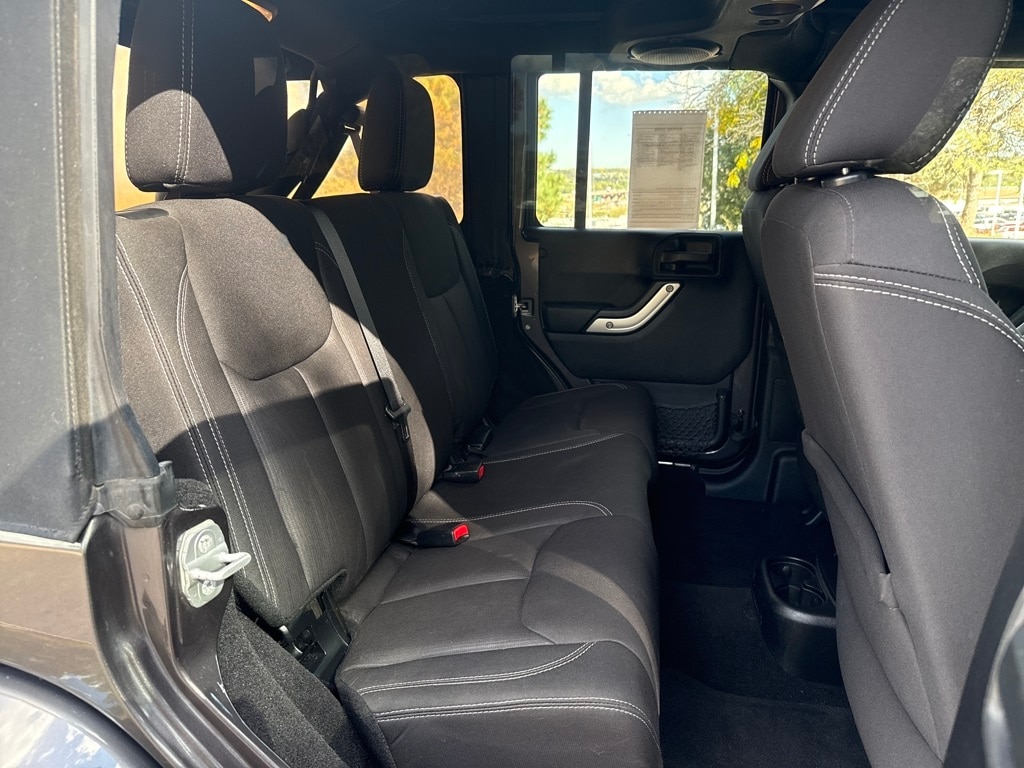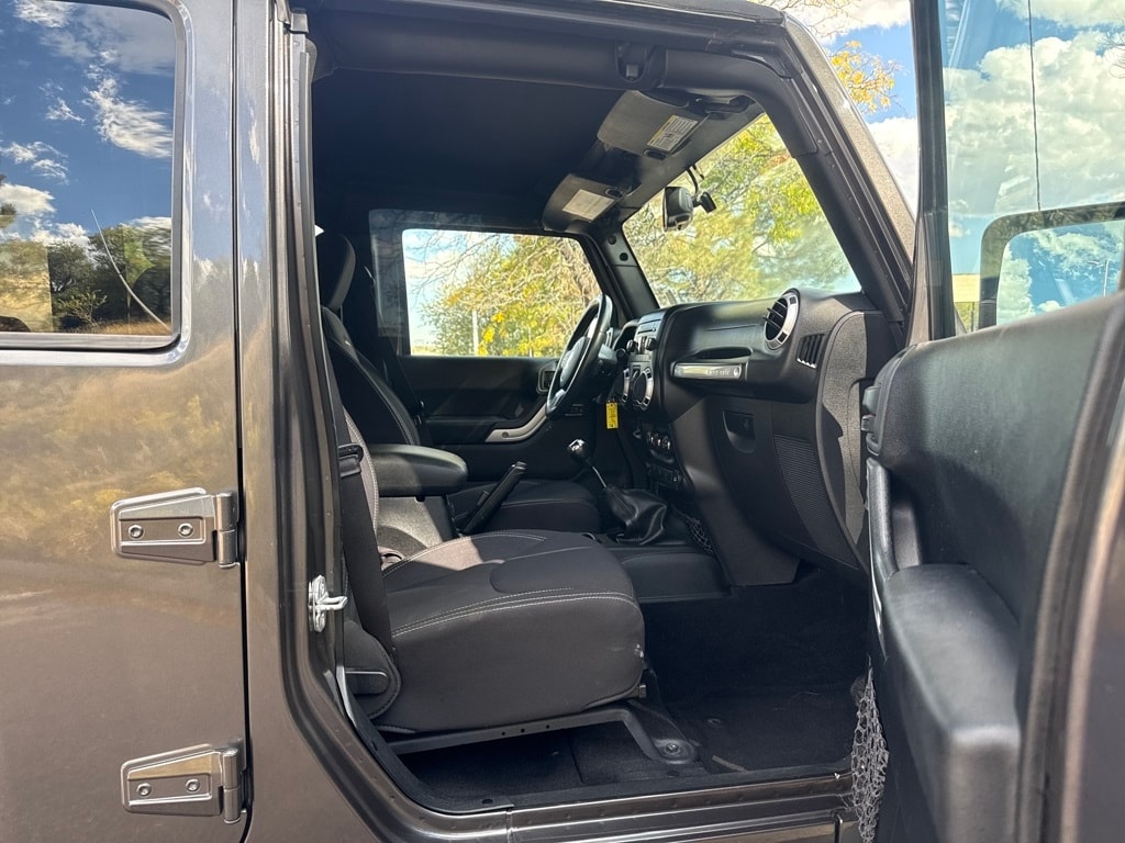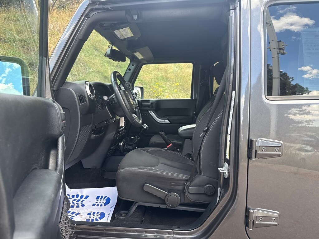 Quick Order Package 23G, 18" x 7.5" Polished Satin Carbon Wheels, 3.21 Rear Axle Ratio, 4-Wheel Disc Brakes, 7 Speakers, ABS brakes, Air Conditioning, Alloy wheels, AM/FM radio, Audio Jack Input for Mobile Devices, Auto-dimming Rear-View mirror, Brake assist, CD player, Cloth Bucket Seats, Compass, Driver door bin, Driver vanity mirror, Dual front impact airbags, Electronic Stability Control, Front anti-roll bar, Front Bucket Seats, Front Center Armrest w/Storage, Front fog lights, Front reading lights, Fully automatic headlights, Heated door mirrors, Heavy Duty Suspension w/Gas Shocks, Illuminated entry, Integrated roll-over protection, Leather steering wheel, Low tire pressure warning, Occupant sensing airbag, Outside temperature display, Panic alarm, Passenger door bin, Passenger vanity mirror, Power door mirrors, Power steering, Power windows, Premium Black Sunrider Soft Top, Radio data system, Radio: Uconnect 130 AM/FM/CD/MP3, Rear anti-roll bar, Remote keyless entry, Security system, Speed control, Split folding rear seat, Steering wheel mounted audio controls, Sunrider Soft Top, Tachometer, Tilt steering wheel, Traction control, Trip computer, and Variably intermittent wipers.