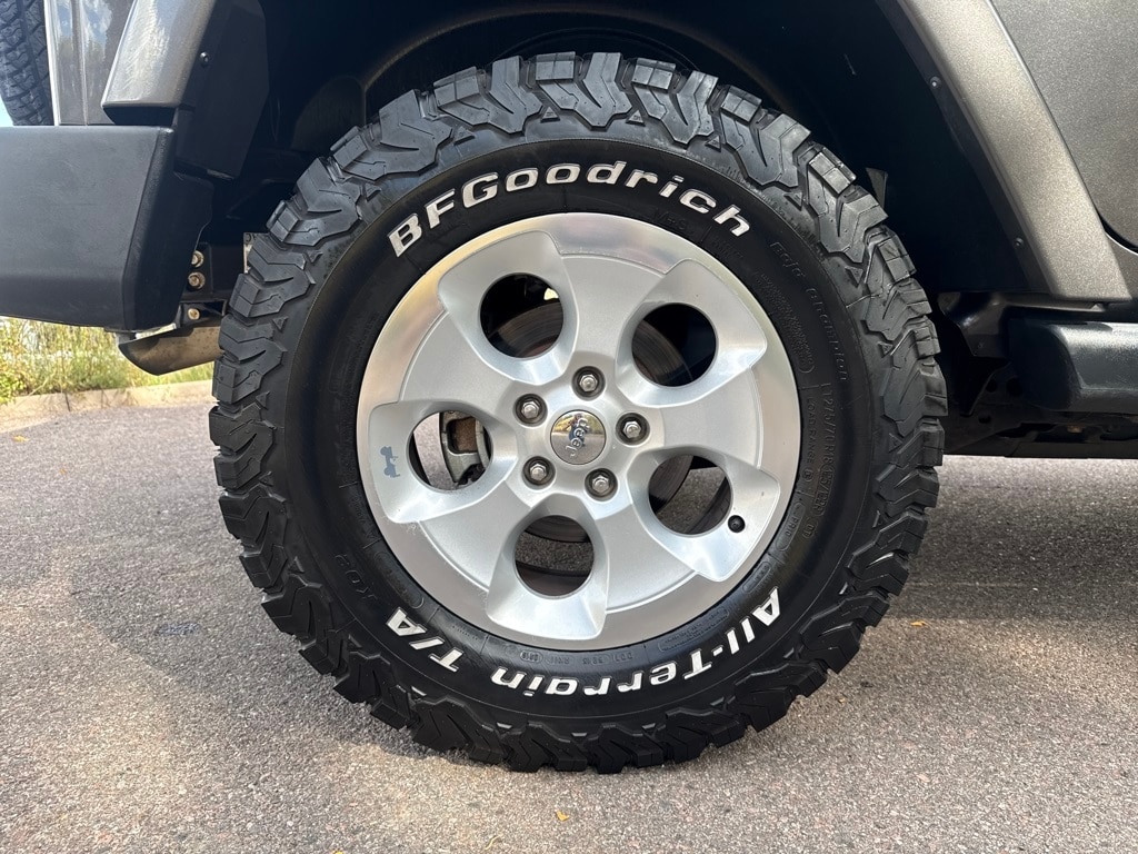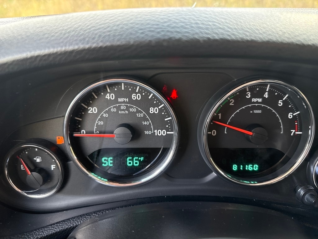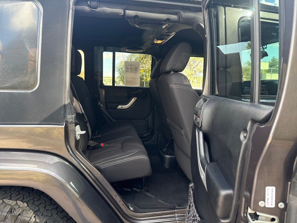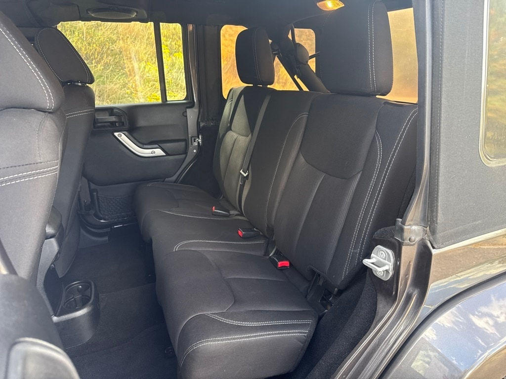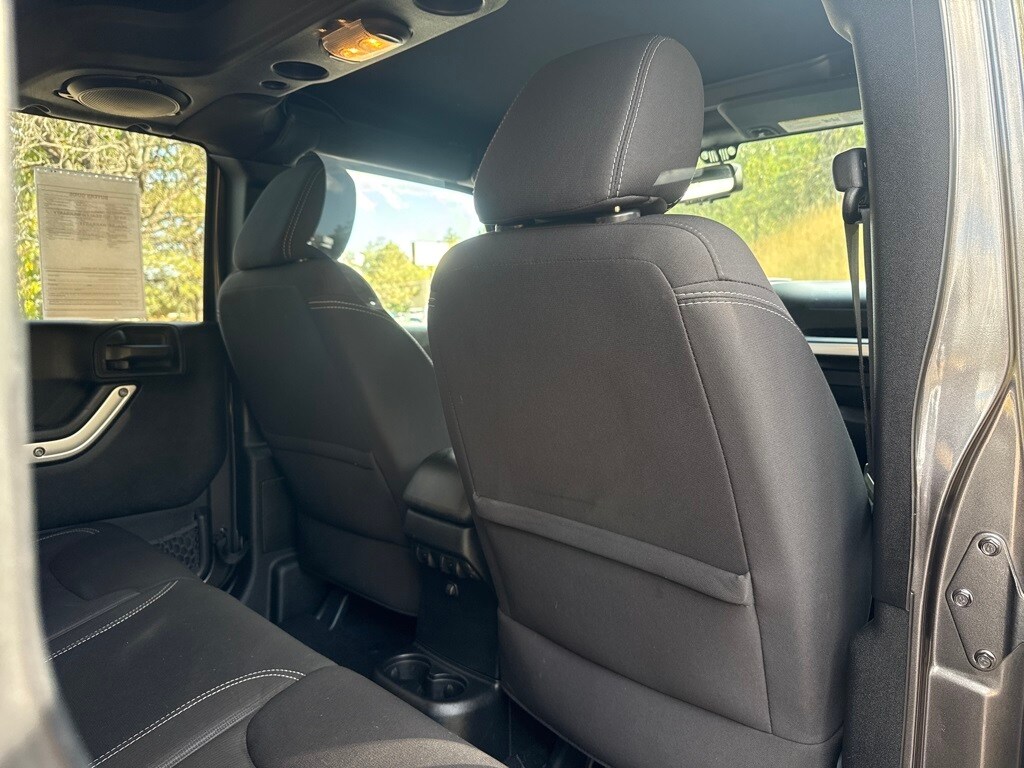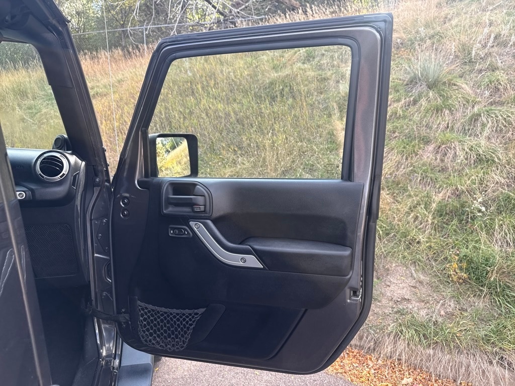 Quick Order Package 23G, 18" x 7.5" Polished Satin Carbon Wheels, 3.21 Rear Axle Ratio, 4-Wheel Disc Brakes, 7 Speakers, ABS brakes, Air Conditioning, Alloy wheels, AM/FM radio, Audio Jack Input for Mobile Devices, Auto-dimming Rear-View mirror, Brake assist, CD player, Cloth Bucket Seats, Compass, Driver door bin, Driver vanity mirror, Dual front impact airbags, Electronic Stability Control, Front anti-roll bar, Front Bucket Seats, Front Center Armrest w/Storage, Front fog lights, Front reading lights, Fully automatic headlights, Heated door mirrors, Heavy Duty Suspension w/Gas Shocks, Illuminated entry, Integrated roll-over protection, Leather steering wheel, Low tire pressure warning, Occupant sensing airbag, Outside temperature display, Panic alarm, Passenger door bin, Passenger vanity mirror, Power door mirrors, Power steering, Power windows, Premium Black Sunrider Soft Top, Radio data system, Radio: Uconnect 130 AM/FM/CD/MP3, Rear anti-roll bar, Remote keyless entry, Security system, Speed control, Split folding rear seat, Steering wheel mounted audio controls, Sunrider Soft Top, Tachometer, Tilt steering wheel, Traction control, Trip computer, and Variably intermittent wipers.