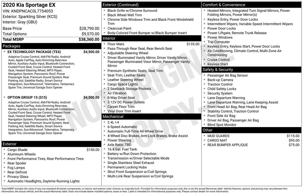 Sparkling Silver 2020 Kia Sportage EX AWD 6-Speed Automatic Electronic with Overdrive 2.4L I4 DGI DOHC 16V 22/26 City/Highway MPG