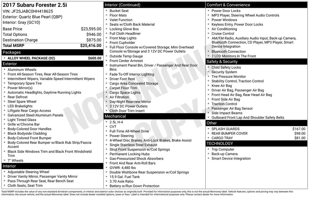 Alloy Wheel Package (17" Machine-Finished Alloy Wheels and Black Finish Roof Rails), 3.70 Axle Ratio, 4 Speakers, 4-Wheel Disc Brakes, ABS brakes, Air Conditioning, AM/FM radio, Brake assist, Bumpers: body-color, Cargo Tray, CD player, Cloth Upholstery, Driver door bin, Driver vanity mirror, Dual front impact airbags, Dual front side impact airbags, Electronic Stability Control, Emergency communication system: STARLINK, Exterior Parking Camera Rear, Four wheel independent suspension, Front anti-roll bar, Front Bucket Seats, Front Center Armrest, Front reading lights, Illuminated entry, Knee airbag, Low tire pressure warning, Occupant sensing airbag, Outside temperature display, Overhead airbag, Overhead console, Panic alarm, Passenger door bin, Passenger vanity mirror, Power door mirrors, Power steering, Power windows, Radio data system, Radio: Subaru Starlink 6.2" Multimedia System, Rear anti-roll bar, Rear Bumper Cover, Rear window defroster, Rear window wiper, Remote keyless entry, Security system, Speed control, Splash Guards, Split folding rear seat, Steering wheel mounted audio controls, Tachometer, Telescoping steering wheel, Tilt steering wheel, Traction control, Trip computer, Variably intermittent wipers, and Wheels: 17" Steel w/Center Cap.