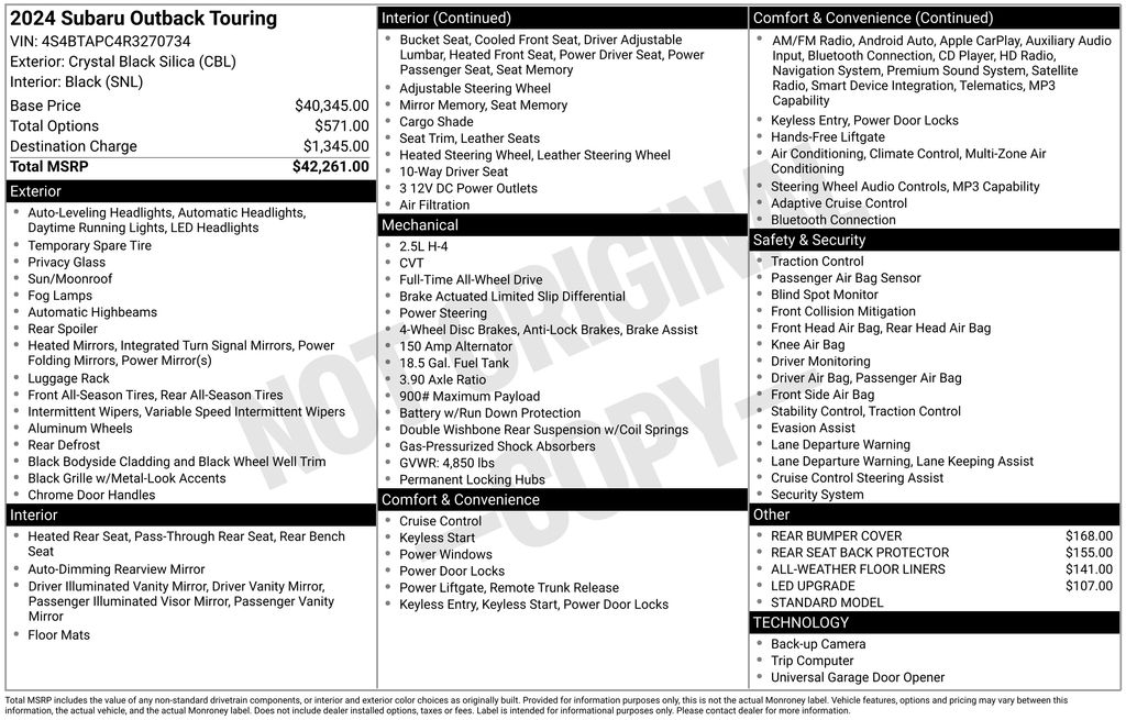 Crystal Black Silica 2024 Subaru Outback Touring AWD CVT Lineartronic 2.5L 4-Cylinder DOHC 16V 26/32 City/Highway MPG